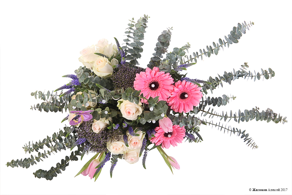 Состав: Роза одноголовая (Эквадор) - 10Тюльпан - 5 Гербера - 3 Вероника - 10 Эвкалипт - 1 Трахелиум - 3 Декор "Бабочка" - 1 Коробка круглая 24х27 (белая) - 1 |