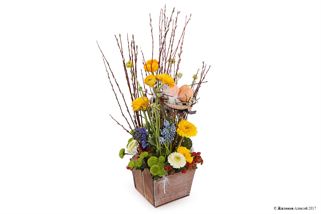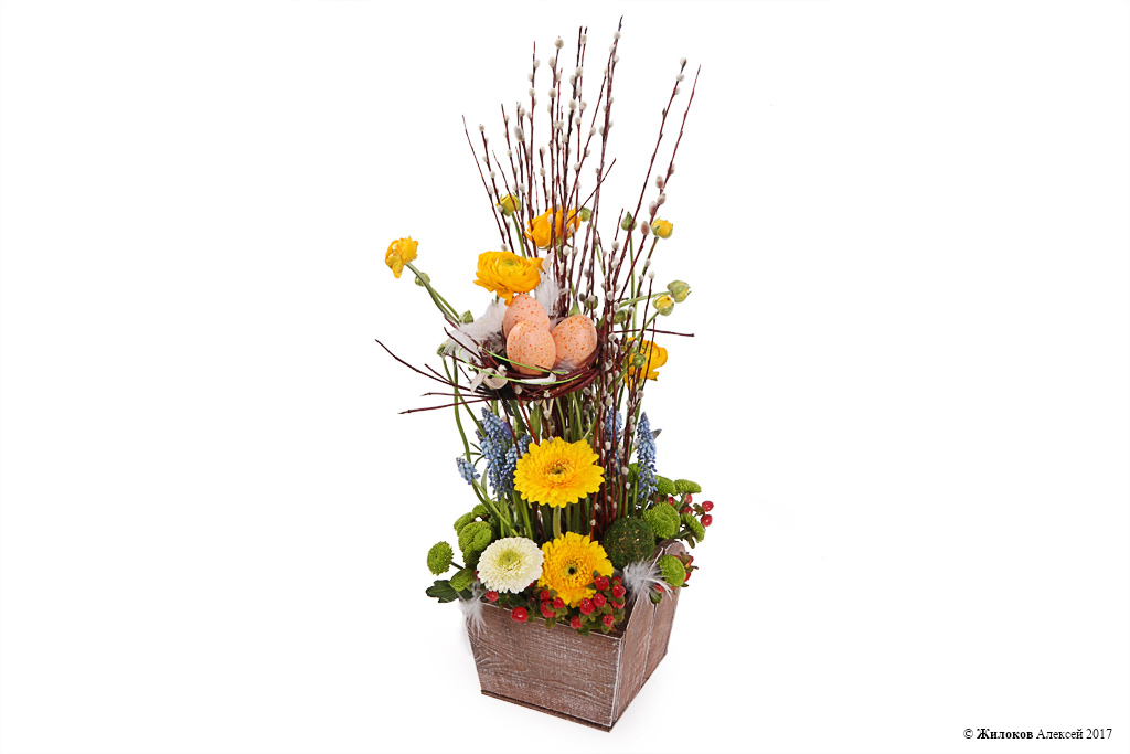 Состав: Хризантема кустовая - 3Гиперикум - 3 Краснотал - 1 Мускари - 10 Ранункулюс - 5 Верба - 3 Гербера мини - 6 Гиацинт - 1 Шар декоративный "Мох" - 2 Декор "Яйцо" - 3 Кашпо "Сердце" - 1 |