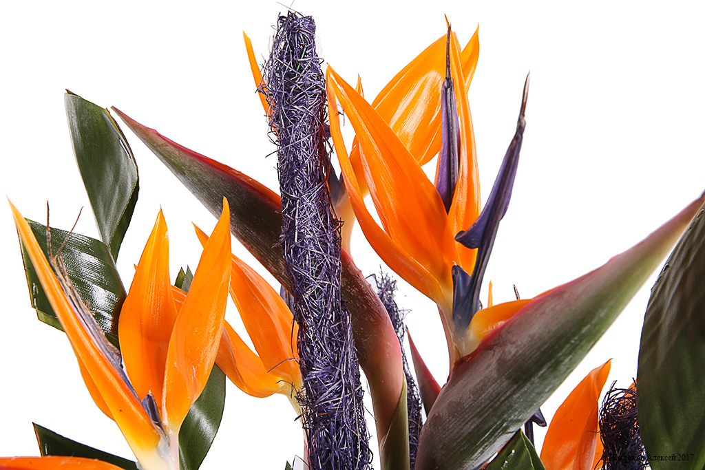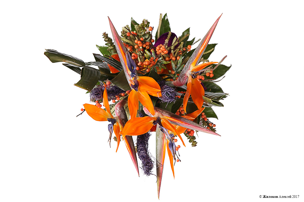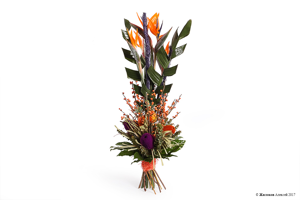 Состав: Стрелиция - 5Банксия - 4 Аралия - 4 Илекс - 3 Параномус - 1 Лист стрелиции - 2 Декор - 2 |