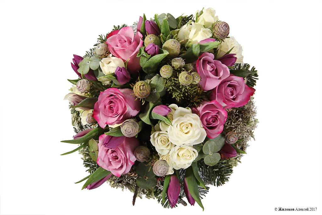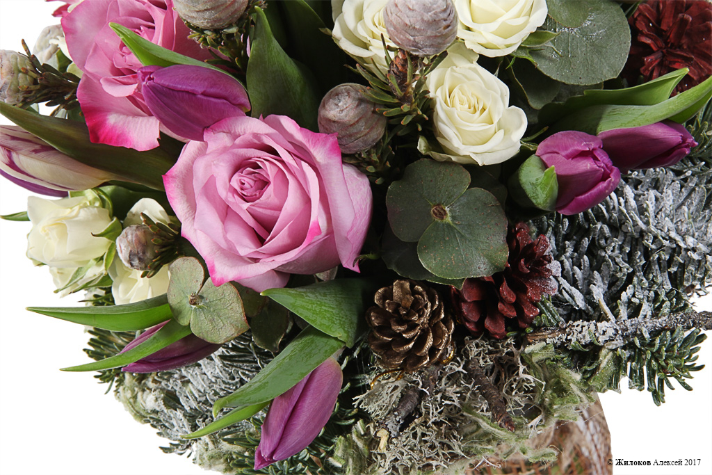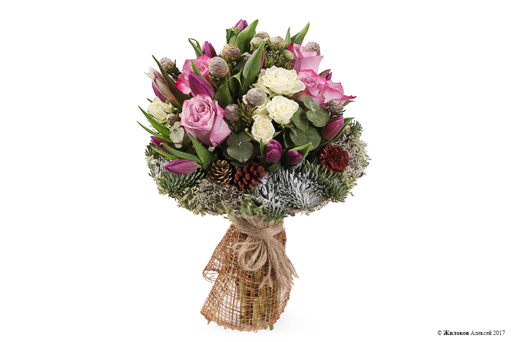 Описание: Чудесный зимний букет из белых и розовых роз, фиолетовых тюльпанов, зеленых веточек нобилиса, словно припорошенных снегом, передаст Вашу любовь и душевное тепло адресату, наполнит помещение праздничным уютом и хорошим настроением. Получатель будет просто очарован! |