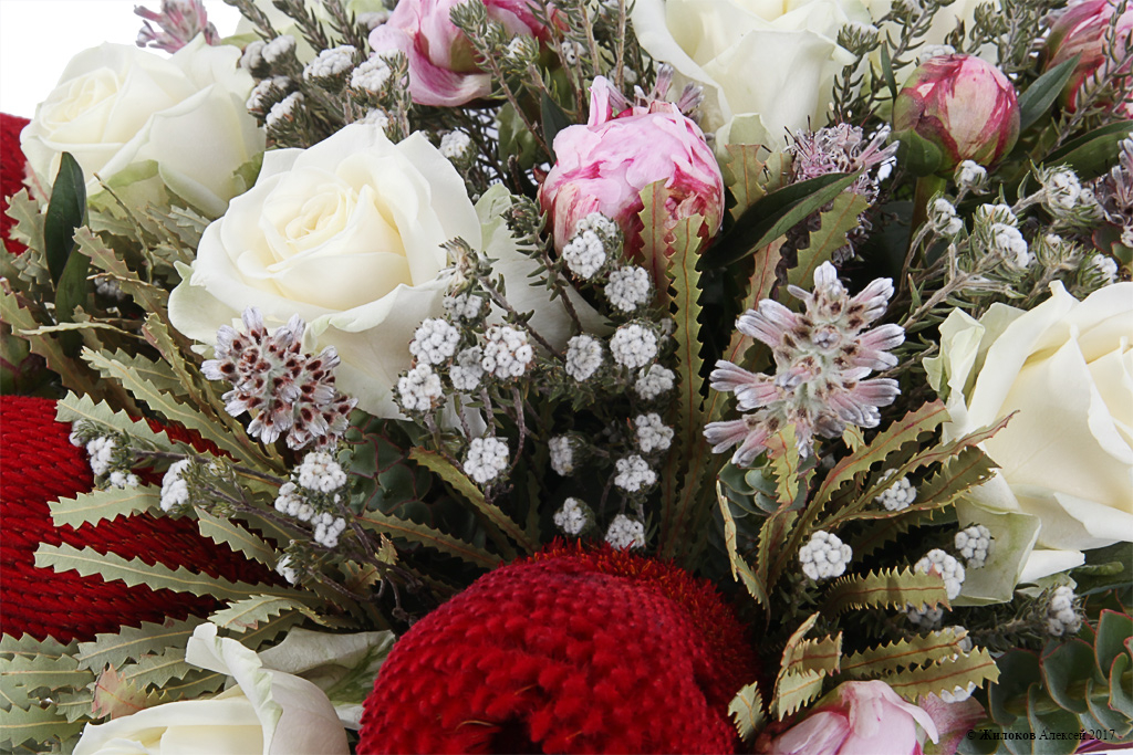 Состав: Банксия - 3Пион - 9 Роза Аваланш - 10 Параномус - 1 Коттон Буш - 1 Коробка круглая 24х27 (голубая) - 1 |