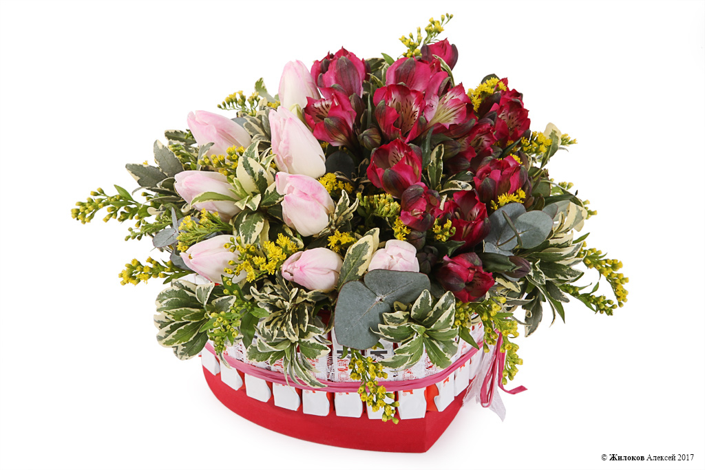 Состав: Тюльпан - 9Альстромерия - 3 Питоспорум - 7 Солидаго - 7 Коробка "Сердце" мини (19х17х9) - 1 Kinder шоколад (упаковка) - 8 |
