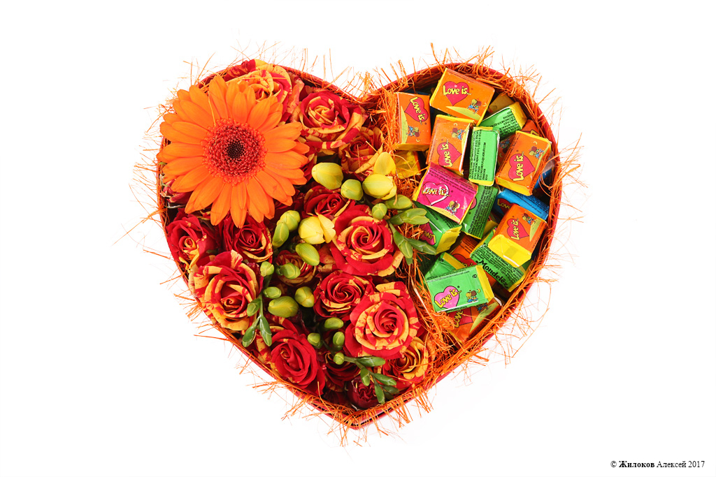 Настоящую вспышку чувств и пожар любви символизирует эта цветочная композиция в коробке в форме сердца. Ведь главная роль здесь отведена невероятно эффектной розе Фаер Флеш с бутонами ярко-красного цвета и жёлтыми полосами на лепестках. Также прекрасным дополнением к такому подарку служит жевательная резинка Love is, которая добавит в праздничную атмосферу нотки романтики и детской искренней радости.