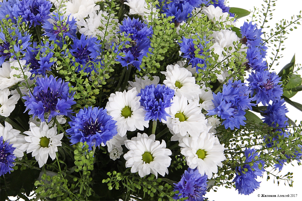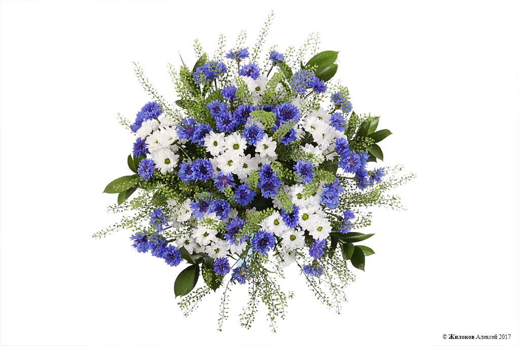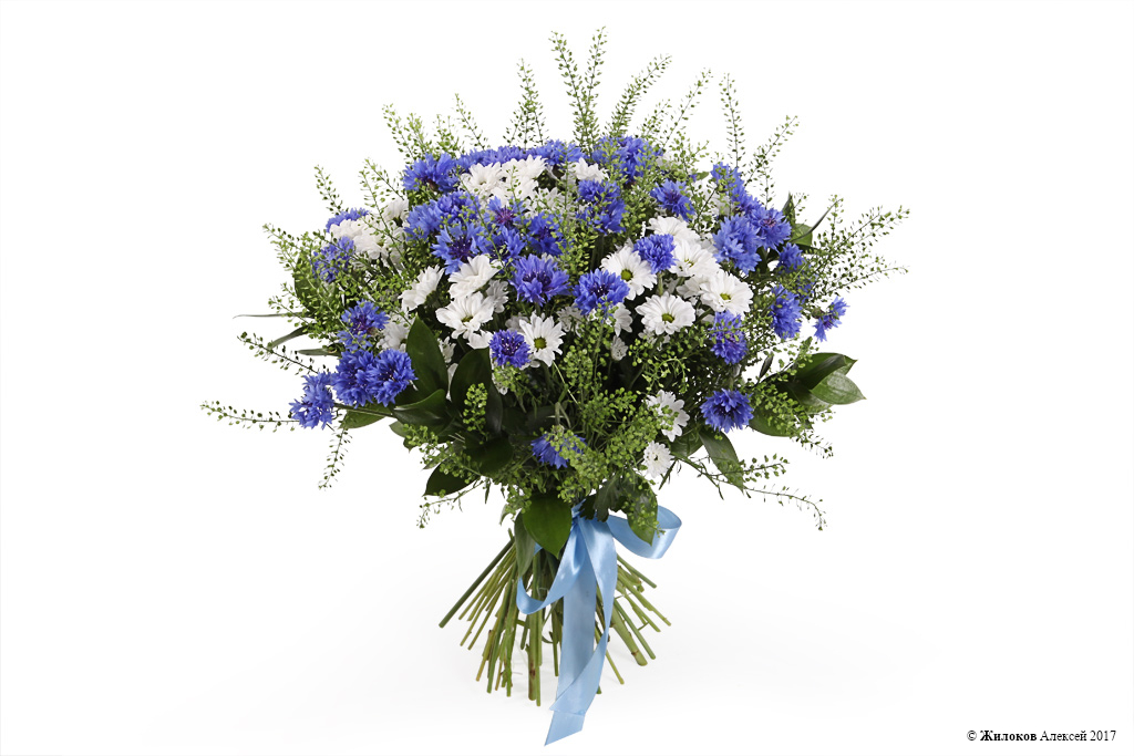 Описание: Небесно-синие васильки, белоснежные хризантемы и веточки ярутки – изящный полевой букет, который станет прелестным подарком для юной и мечтательной натуры. Милый и обаятельный подарок, символизирующий молодость и беззаботность, очарует своей красотой любого получателя! |
