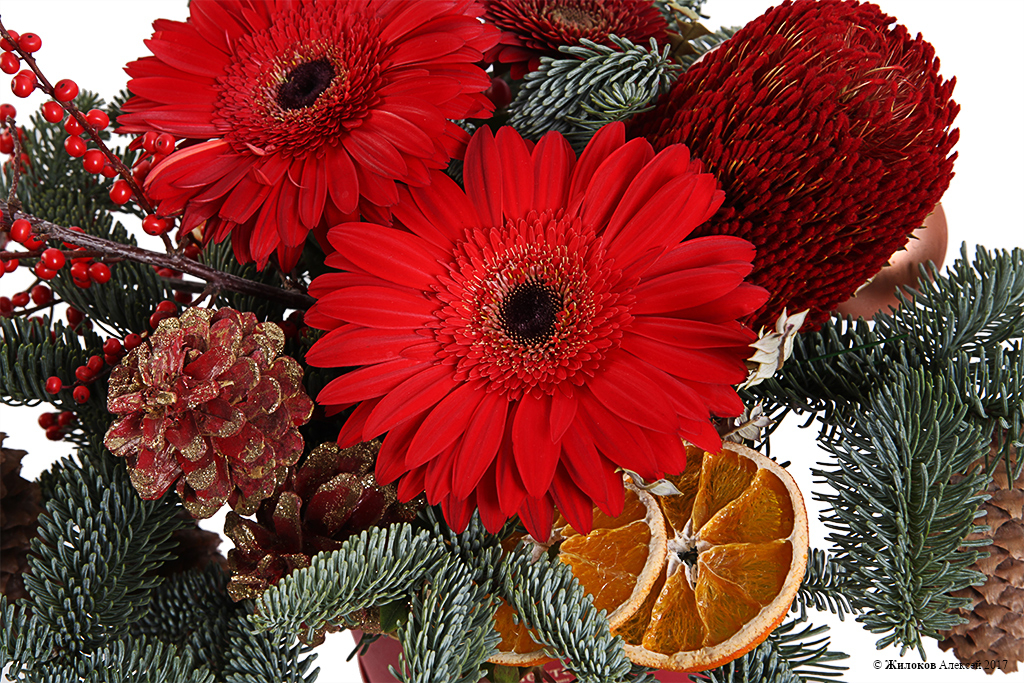 Состав: Банксия - 1Гербера - 3 Гиперикум - 3 Илекс - 2 Нобилис - 2 Украшение "Шишка" - 2 Шар новогодний - 2 Шишка еловая - 3 Долька апельсина - 1 Коробка круглая 18х19 (красная) - 1 |