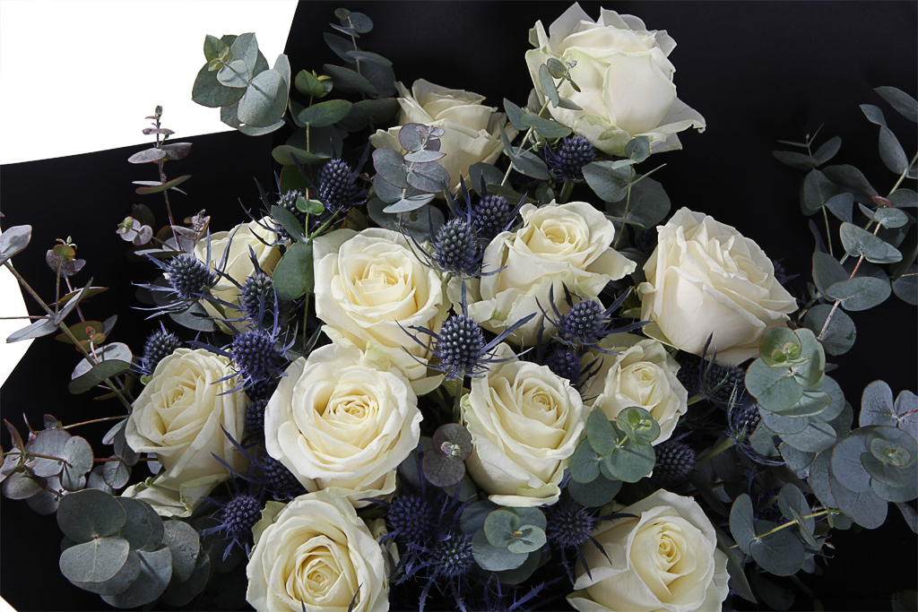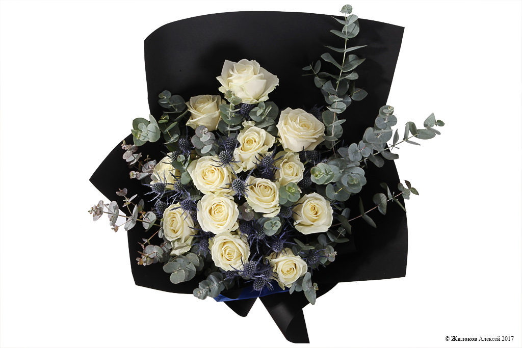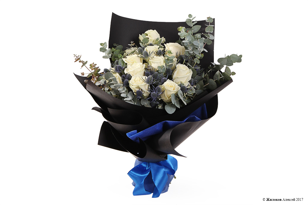 Элегантный и стильный зимний букет, составленный из белоснежных роз Аваланш, колючек эрингиума и веточек эвкалипта. Оригинальности такому подарку придает стильная бумажная упаковка контрастного черного цвета, которая выгодно подчеркивает всю красоту белых бутонов, и широкая атласная лента цвета индиго. Такой подарок запомнится получателю надолго!