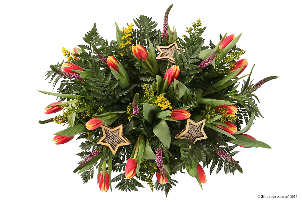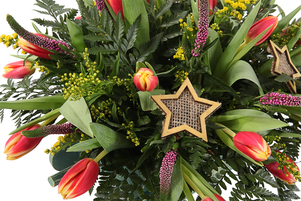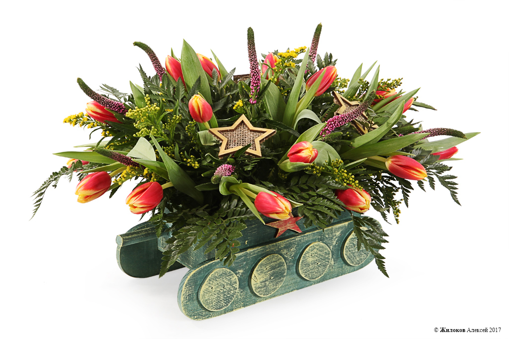 Состав: Тюльпан - 20Вероника - 10 Солидаго - 10 Лезер Ферн (папоротник) - 1 Украшение на палочке - 3 Кашпо "Танк" - 1 |