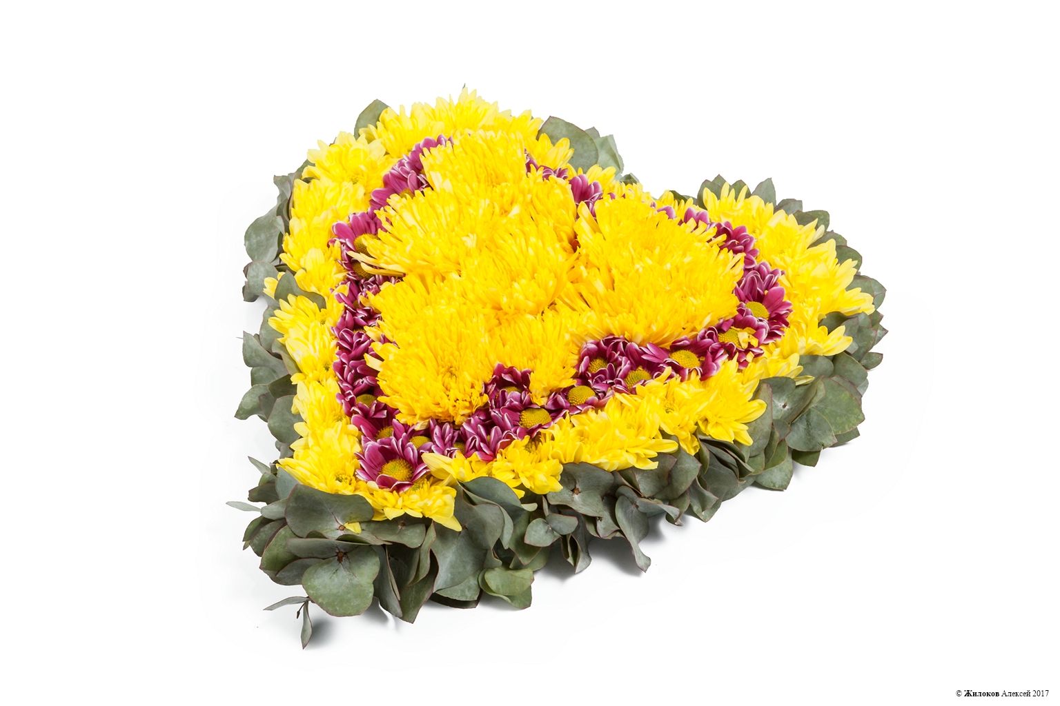 Состав: Хризантема Сингл - 10Хризантема кустовая - 10 Эвкалипт - 1 Оазис-сердце - 1 |
