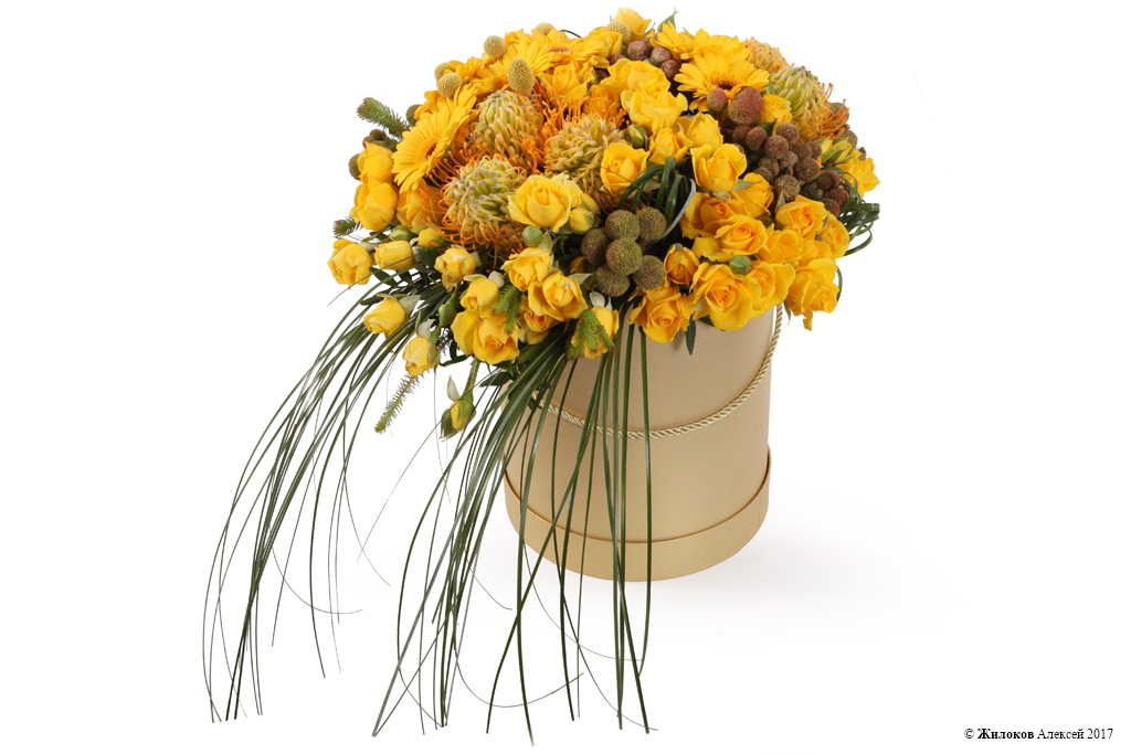 Описание: Букет в желтых тонах, в золотистой шляпной коробке – это настоящее сокровище, которое Вы можете подарить с самыми теплыми пожеланиями. Герберы, экзотические шары леукоспермумов и множество маленьких розочек создают восхитительную гармонию, а асимметричный шлейф из свежей зелени делает вид букета еще эффектнее. |