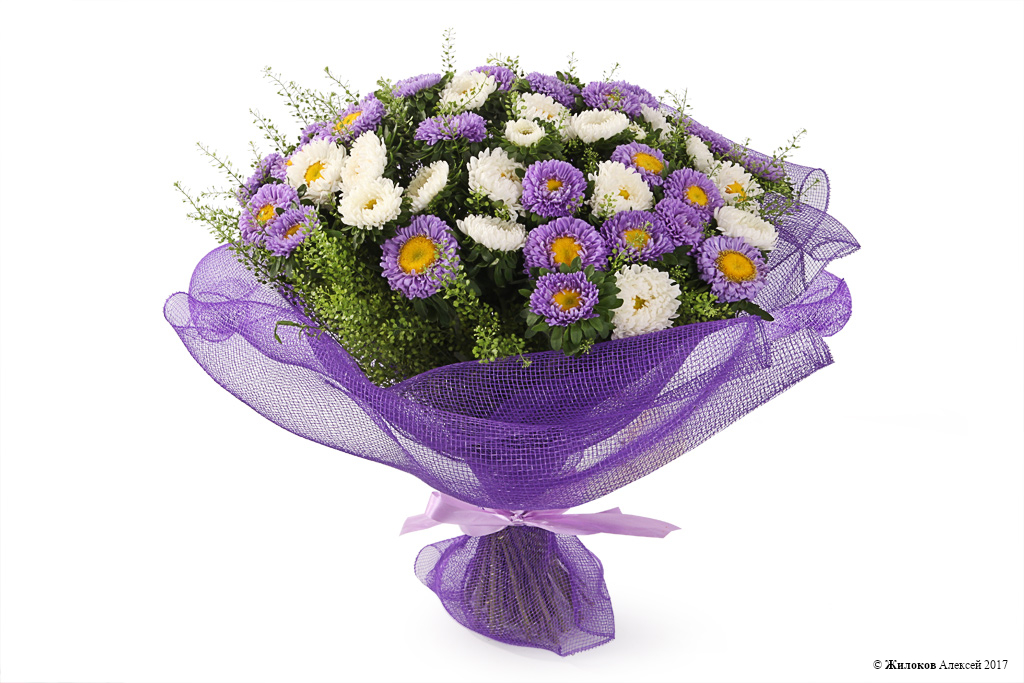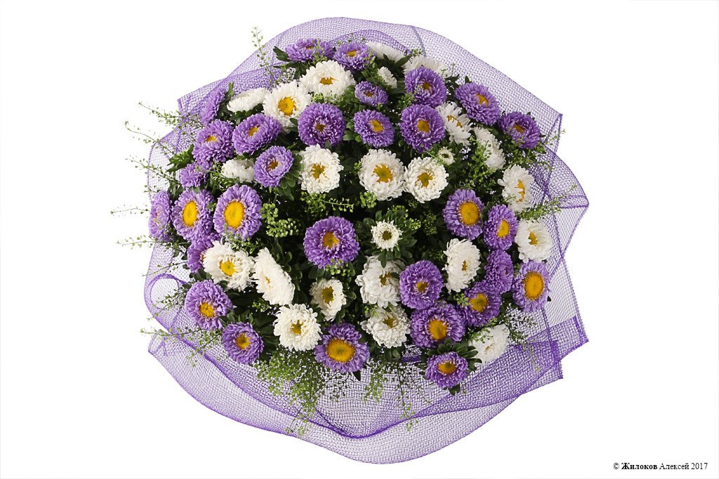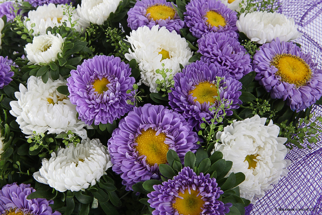 Необыкновенно сказочный букет приятной бело-фиолетовой палитры из пышных цветов семейства Астровые - каллистефусов. Фиолетовый цвет, согласно учению фэн-шуй, означает богатство и успех. Именно поэтому, такой букет станет эффектным и символическим подарком к любому торжеству и для любого получателя!