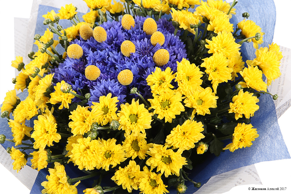 Удивительный букет из небесно-синих васильков, желтой хризантемы и шариков краспедии порадует своего получателя своим ярким и позитивным цветом, - цветом счастья, радости и солнечного тепла. Это красочный букет станет прекрасным вариантом подарка, который раскрасит сочными красками серые будни!