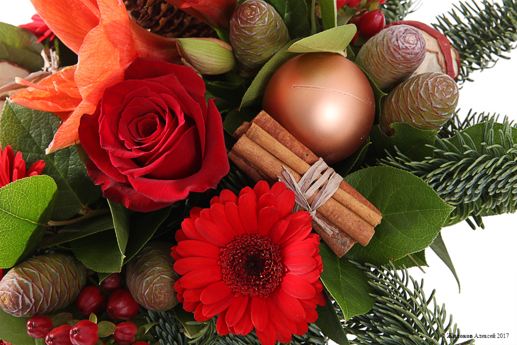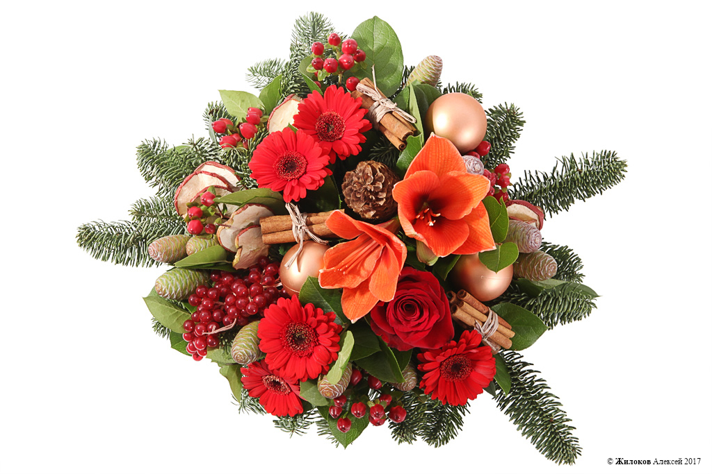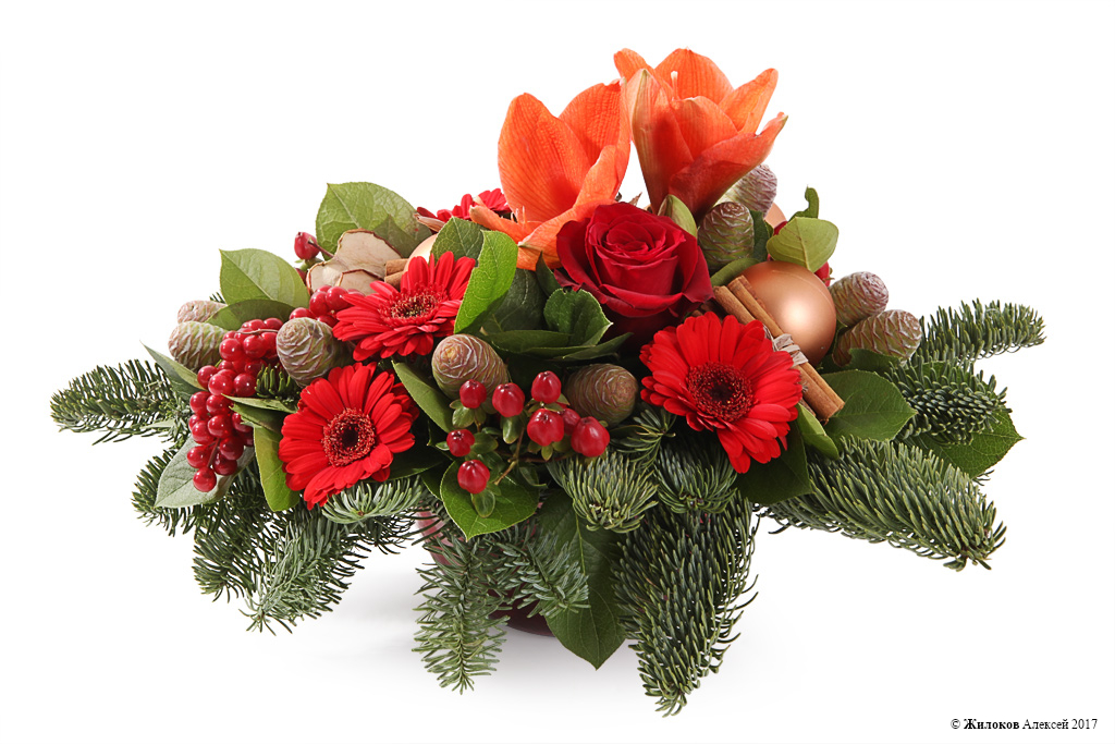 Описание: Отличный подарок на Новый год и Рождество для родных, друзей и близкий – оригинальная и яркая цветочная композиция в кашпо. Хвойная зелень, алые герберы и рыжие крупные гиппеаструмы выглядят живо, празднично и торжественно, принося в дом атмосферу волшебства и чуда. |