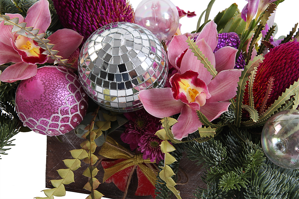 Состав: Нобилис - 3Фрезия - 5 Банксия - 2 Стриктум - 1 Хризантема кустовая - 2 Орхидея Цимбидиум - 1 Удлинители для орхидей - 7 Эвкалипт - 1 Шар новогодний - 6 Кашпо "Ящик с ручкой" - 1 |