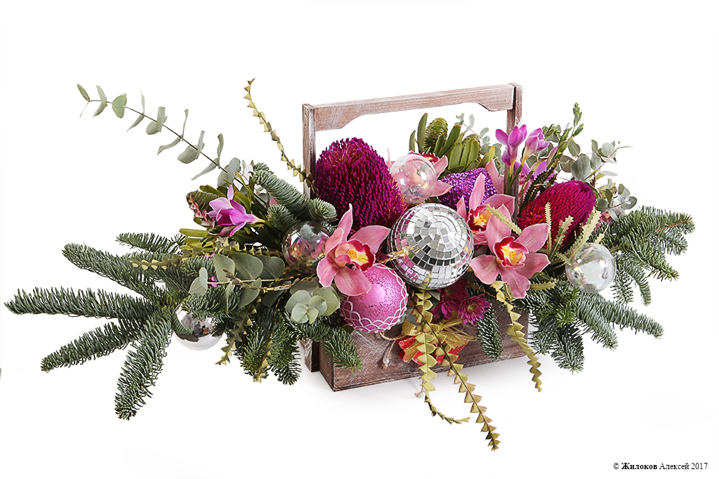 Описание: Оригинальная новогодняя композиция в деревянном ящичке с ручкой, состоящая из экзотических цветов, хвойных веточек и новогодних игрушек, поможет создать дома незабываемую, радостную атмосферу праздника и наполнит дни улыбками, теплом и ожиданием близкого счастья. |