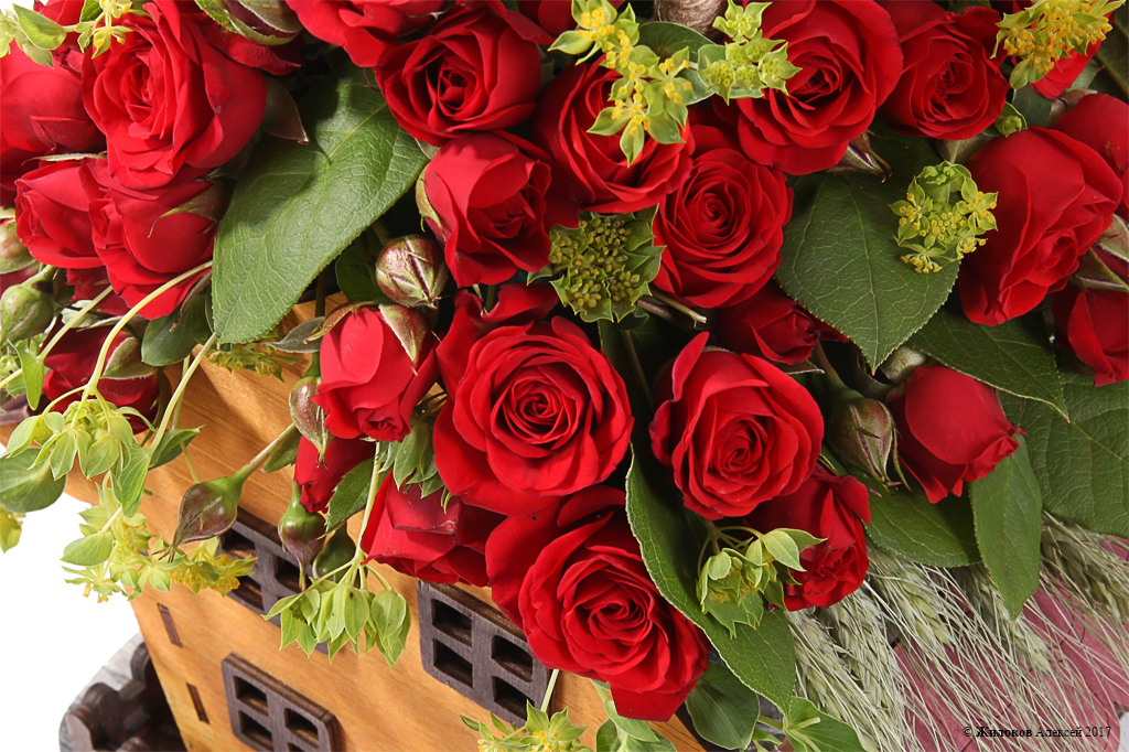 Описание: Хотите оригинально поздравить супругу или торжественно отметить памятную семейную дату? Оригинальная и очаровательная цветочная композиция из алых кустовых роз размещается на крыше домика, символизирующего домашнее тепло и уют. |