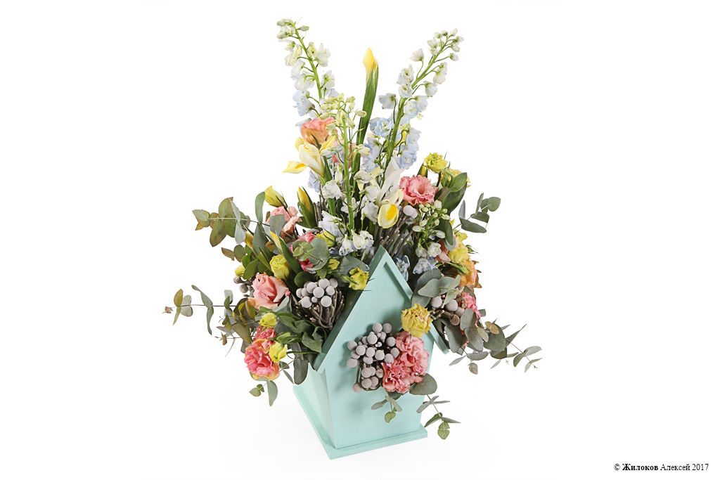 Описание: Словно из сказочного леса появилась эта оригинальная и чарующая цветочная композиция. Невероятное сочетание цветов никого не оставит равнодушным, а стильное кашпо в виде скворечника станет достойным украшением любого интерьера. Такой подарок добавит уюта любому помещению и будет долго напоминать своему обладателю о Вашей заботе и любви. |