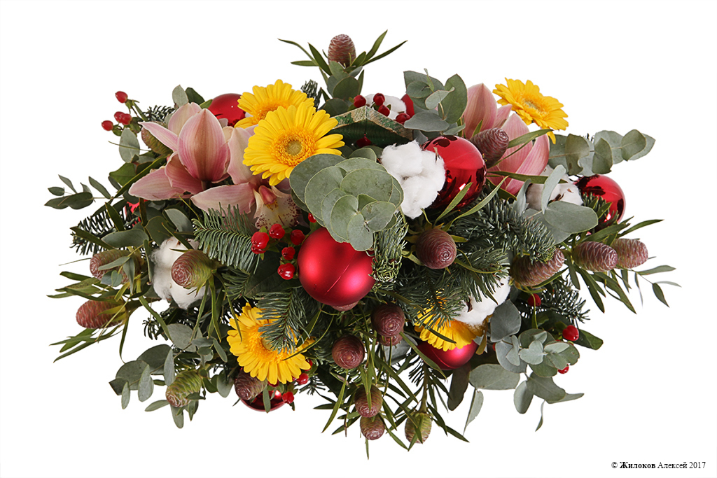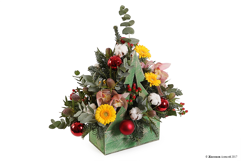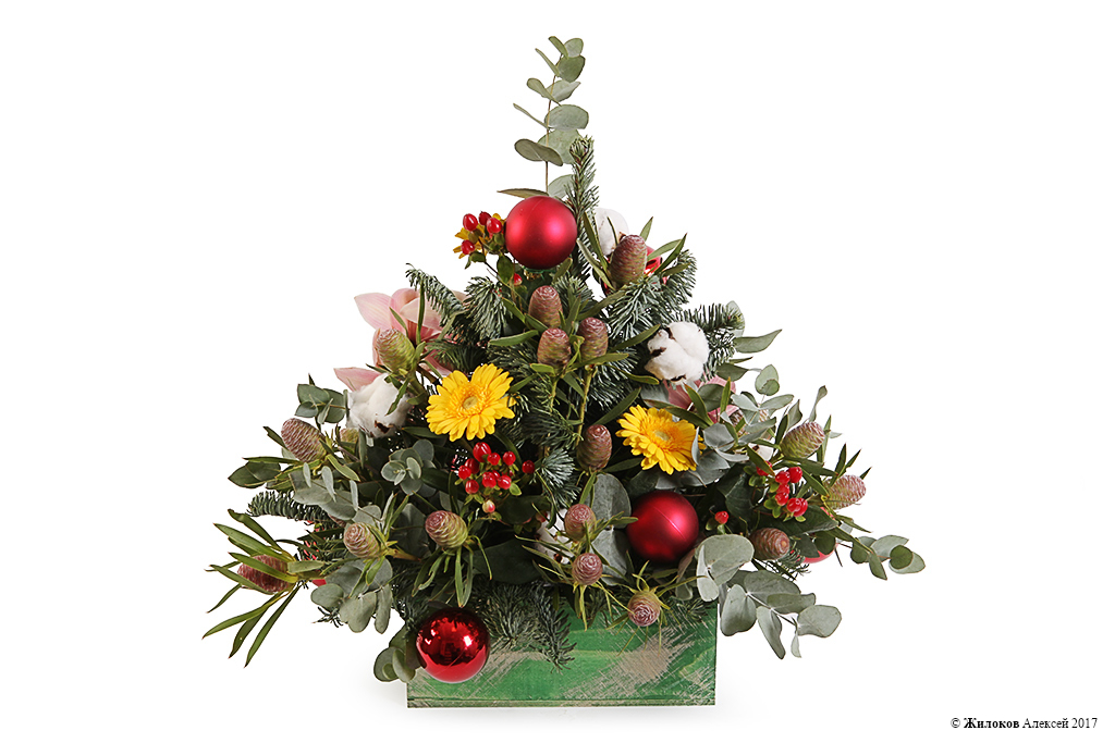 Состав: Нобилис - 1Орхидея Цимбидиум - 1 Эвкалипт - 1 Гиперикум - 5 Гербера мини - 5 Стриктум - 1 Хлопок - 1 Удлинители для орхидей - 5 Шар новогодний - 8 Кашпо "Елочка" - 1 |