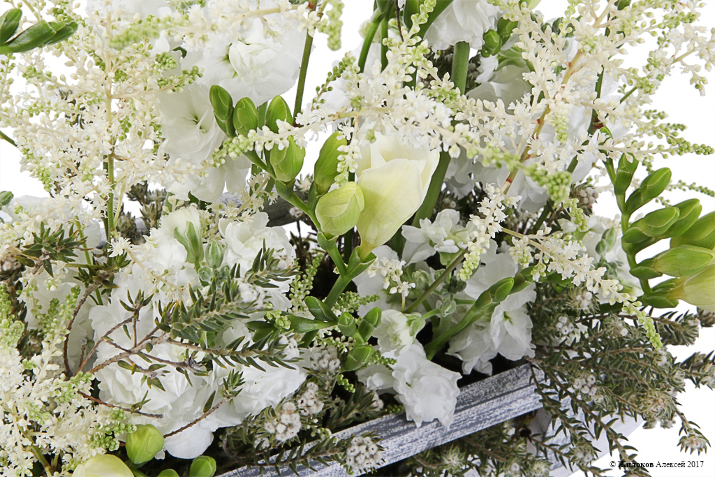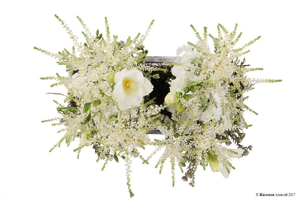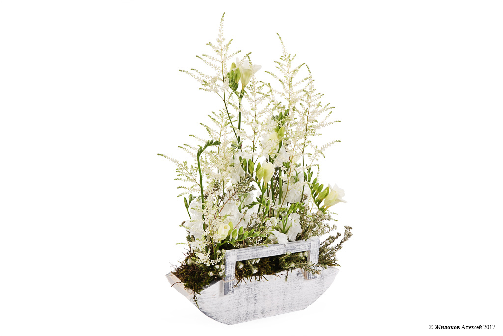 Очаровательная вертикальная цветочная композиция, навеянная воспоминаниями о зимней поре: хрупкие, словно окутанные инеем, веточки астильбы живо сочетаются с белоснежными фрезиями и маттиолой. Деревянное кашпо и декоративный мох создают неповторимый пейзаж, который органично впишется в любой интерьер, освежая его и привнося природную красоту.