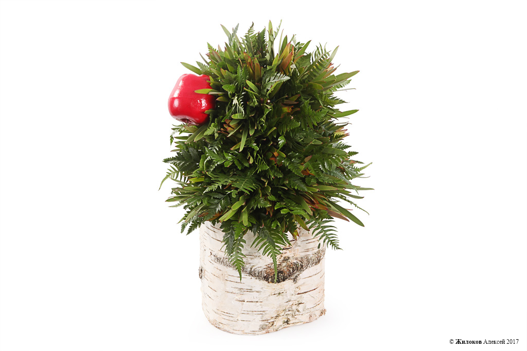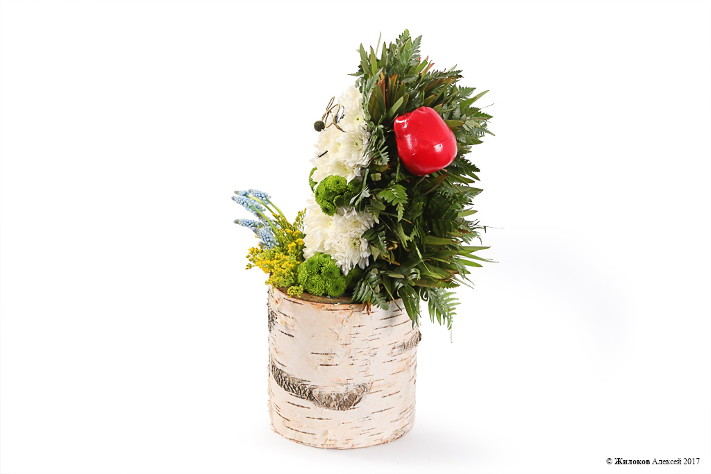 Состав: Хризантема кустовая - 5Хризантема Сантини - 4 Краспедия - 1 Солидаго - 3 Леукадендрон - 2 Лезер Ферн (папоротник) - 1 Свордферн - 1 Декор "Яблоко" - 1 Кашпо "Пенек" - 1 Мускари - 10 |
