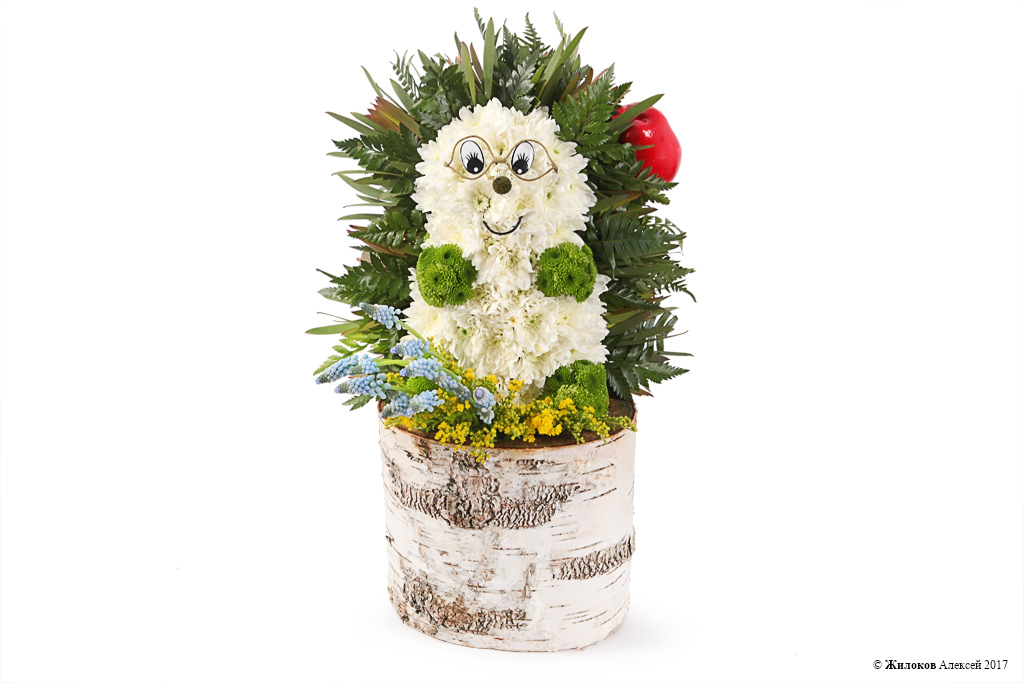Удивительно милый лесной зверек, составленный из живых цветов! Цветочная композиция, которая выразит Ваши добрые чувства и порадует ваших близких, вызовет массу положительных эмоций. Такой подарок станет прекрасным украшением для любого интерьера и будет долго радовать получателя своим сказочным видом!