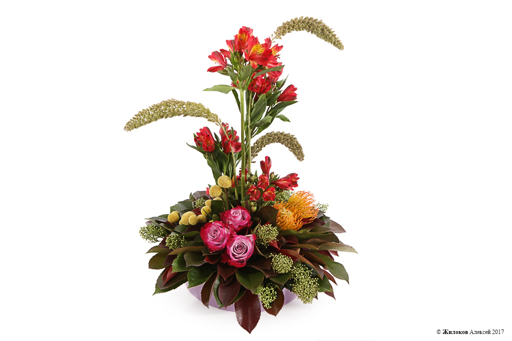 Состав: Роза Дип Перпл - 3Леукоспермум - 3 Скиммия - 1 Фотиния - 10 Альстромерия - 5 Краспедия - 14 Сетария - 3 Чаша ф260 - 1 |