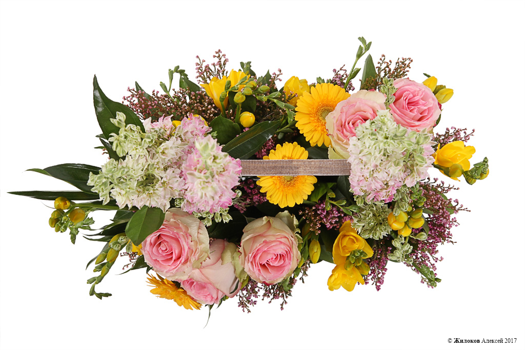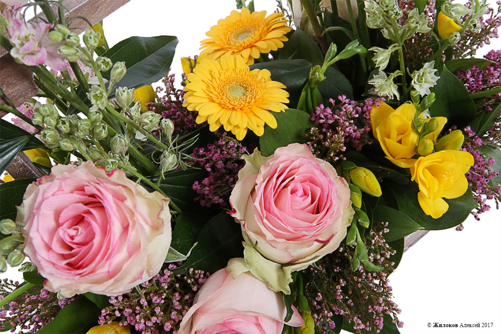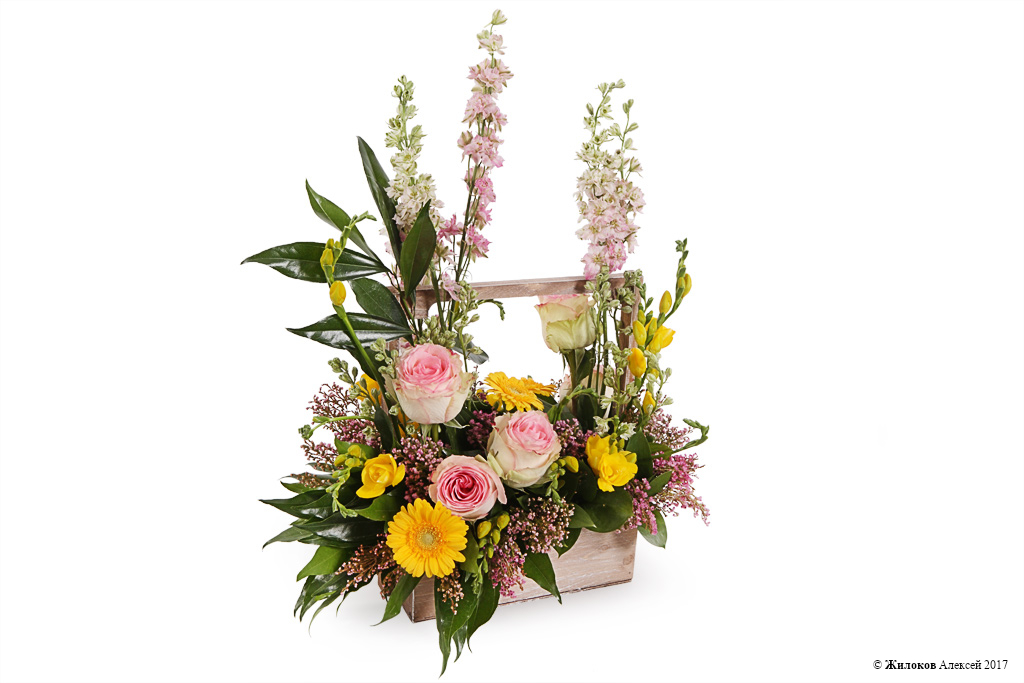 Описание: Оригинальная цветочная композиция в деревянном кашпо способна вызвать улыбки умиления даже у самых завзятых скептиков. Розовые розы и маттиола, желтые фрезии и герберы создают ощущение свежести, любви и тепла, которыми адресат желает поделиться с тем, кому предназначен подарок. |