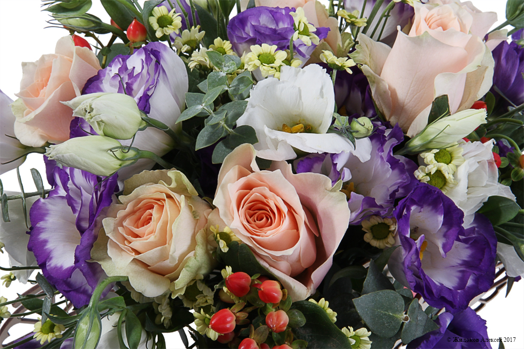 Состав: Роза Фламандский микс - 7Эустома - 1 Хризантема Сантини - 5 Гиперикум - 3 Эвкалипт - 1 Кашпо резное "Карета" - 1 |