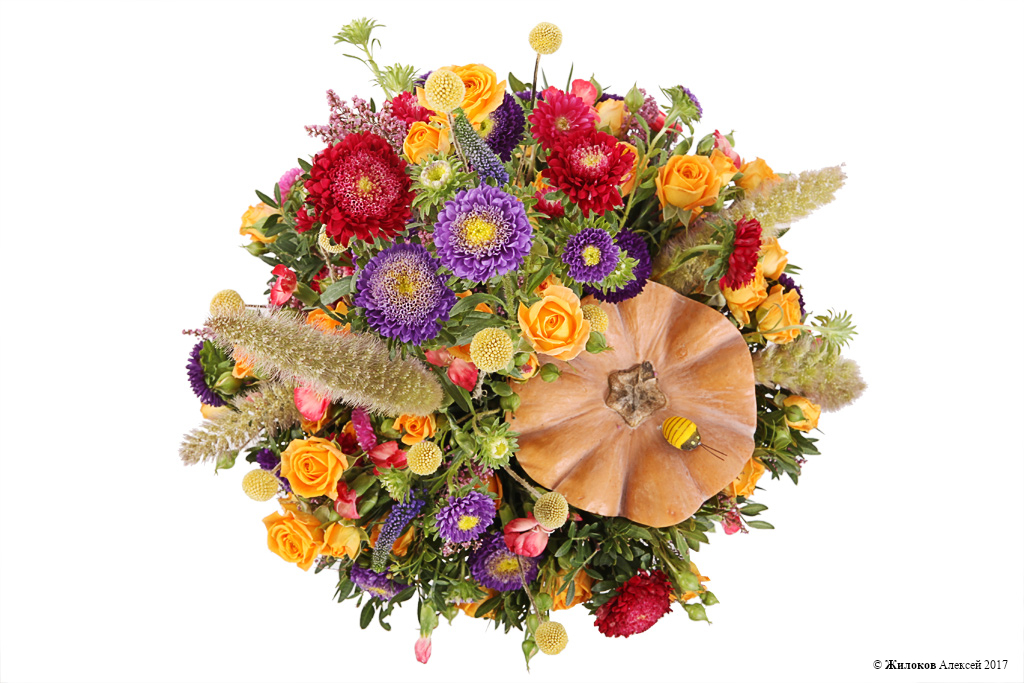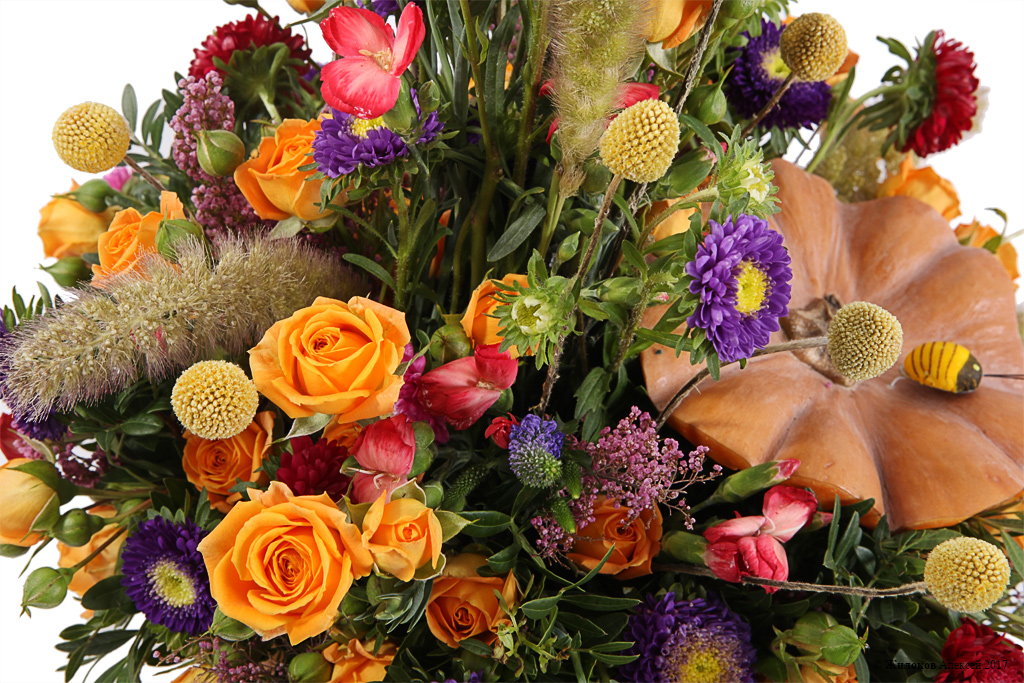 Состав: Роза кустовая (Кения) - 10Каллистефус - 5 Сетария - 4 Лентиско - 1 Гвоздика Тессино - 1 Вероника - 3 Эрика - 1 Краспедия - 10 Декор "Насекомое на вставке перо" - 1 Тыква - 1 |