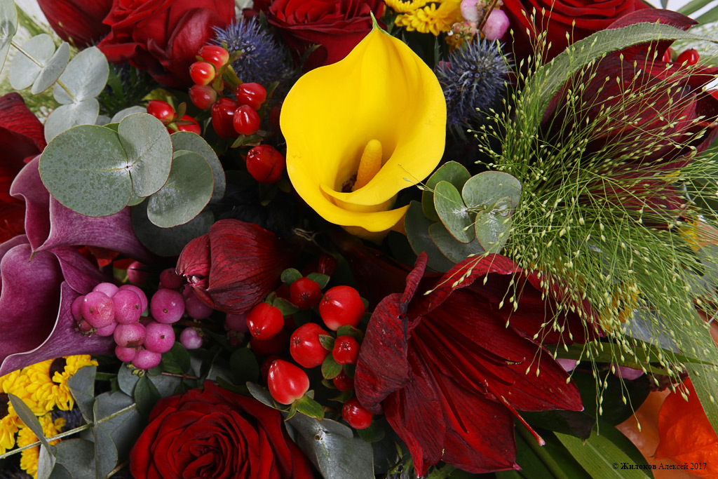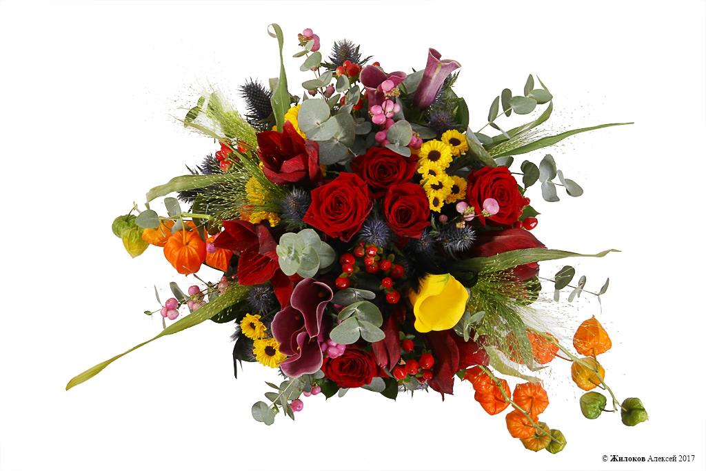 Состав: Тыква - 1Гиппеаструм - 3 Гиперикум - 5 Калла - 6 Эрингиум - 5 Паникум - 5 Симфорикарпус - 1 Хризантема Сантини - 5 Эвкалипт - 1 Рускус - 3 Роза Гран При - 5 Физалис - 3 |