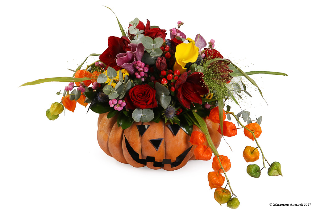Описание: Веселая тыковка с пышной прической из цветов – такую необычную композицию обязательно оценят те, кто празднует Хэллоуин. Подарите тыквенную голову с цветами, и она станет чудесным украшением помещения и отпугнет злых духов от Вашего дома! |