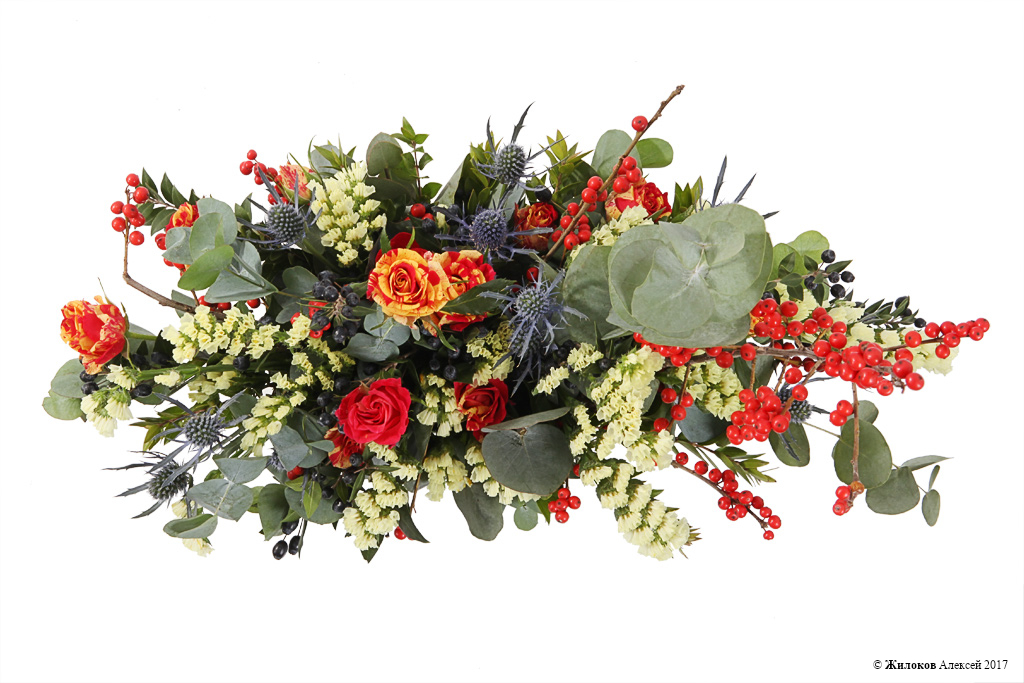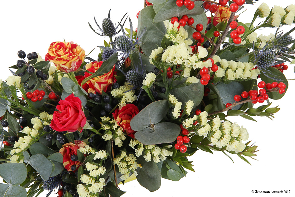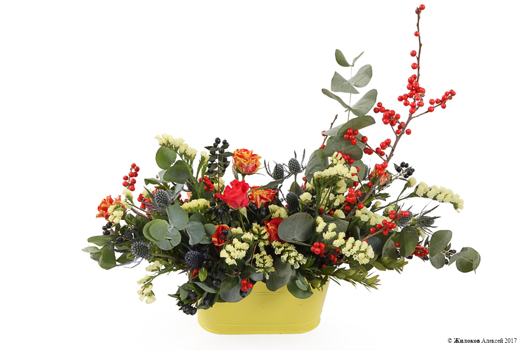 Состав: Роза кустовая (Кения) - 2Илекс - 4 Эрингиум - 9 Статица - 1 Мирто - 1 Эвкалипт - 1 Кашпо металл 23х12х11 - 1 |