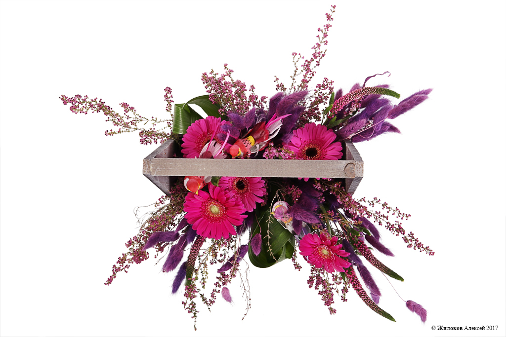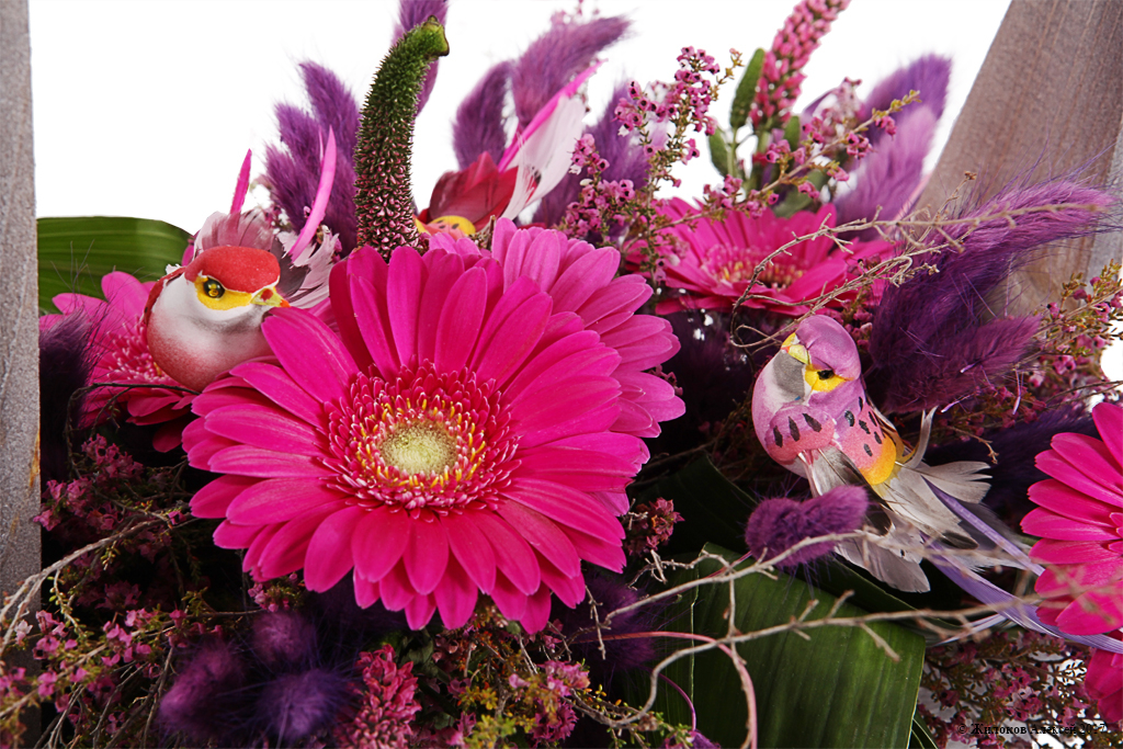 Описание: Яркая и очаровательная композиция в малиновых оттенках - это оригинальный и эффектный подарок для тех, кому обычные букеты цветов кажутся заурядными. Необычное оформление в виде кашпо и декор из летних птиц сделает подарок еще более стильным. |