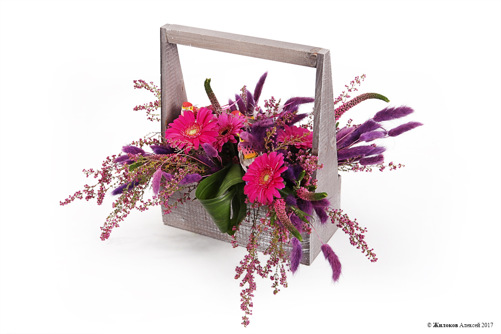 Состав: Эрика - 0.5Гербера мини - 5 Вероника - 5 Лагурус - 1 Украшение "Птица" - 3 Аспидистра - 3 Кашпо "Бордо" - 1 |