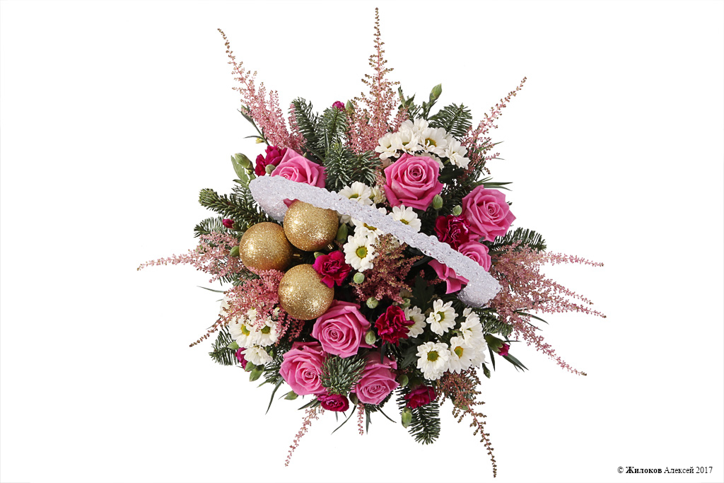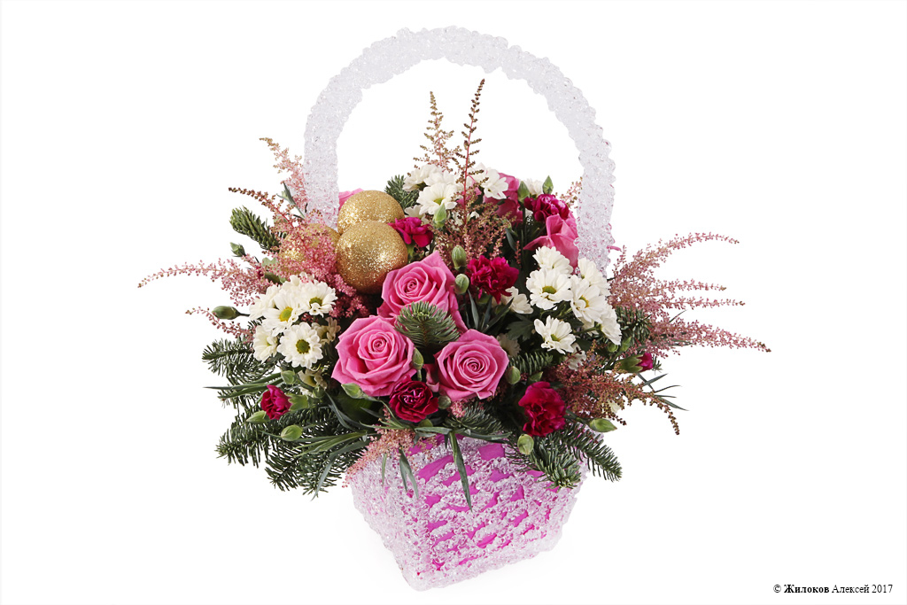 Состав: Нобилис - 1Роза Аква - 7 Хризантема Сантини - 4 Астильба - 5 Гвоздика Тессино - 1 Шар новогодний - 3 Кашпо "Корзинка средняя" (пластик) - 1 |