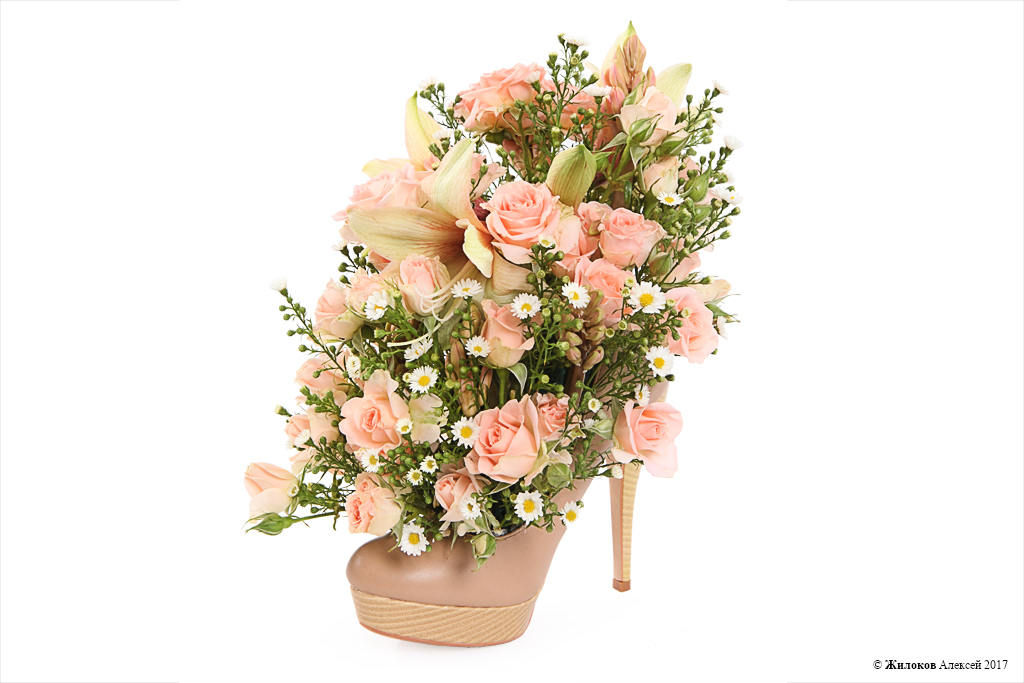 Роскошная, нежная и милая цветочная композиция из очаровательных бело-розовых роз, гиацинтов, гиппеаструма и белоснежных цветочков астры станет незабываемым подарком к любому празднику, ярким украшением любого интерьера. Изюминка такого презента заключается в том, что роль вазы в этой композиции исполняет дамская туфелька! Оригинальный способ удивить и восхитить девушку!