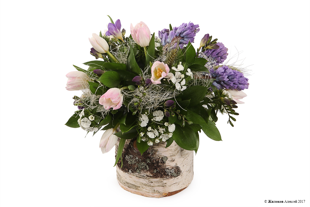 Креативная и удивительная цветочная композиция из живых цветов, составленная в настоящем березовом пеньке! Неповторимый и нетривиальный подарок, который воплощает в себе весеннюю свежесть и природную красоту!
