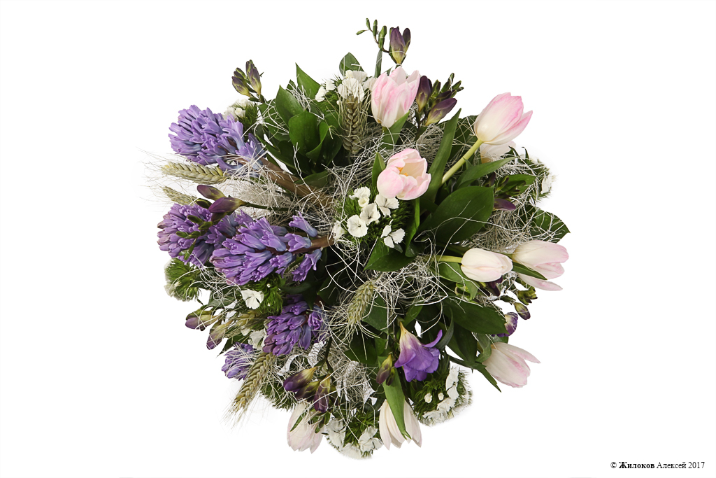 Состав: Рускус - 5Тюльпан - 10 Гиацинт - 5 Фрезия - 10 Диантус барбатус (гвоздика турецкая) - 1 Пшеница (тритикум) - 10 Кашпо "Пенек" - 1 |