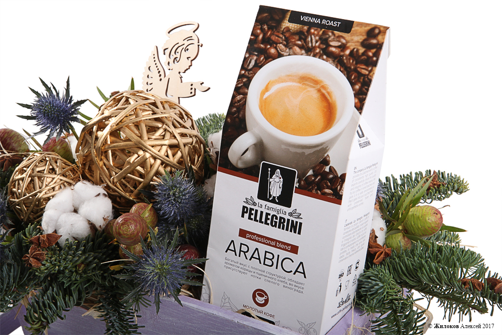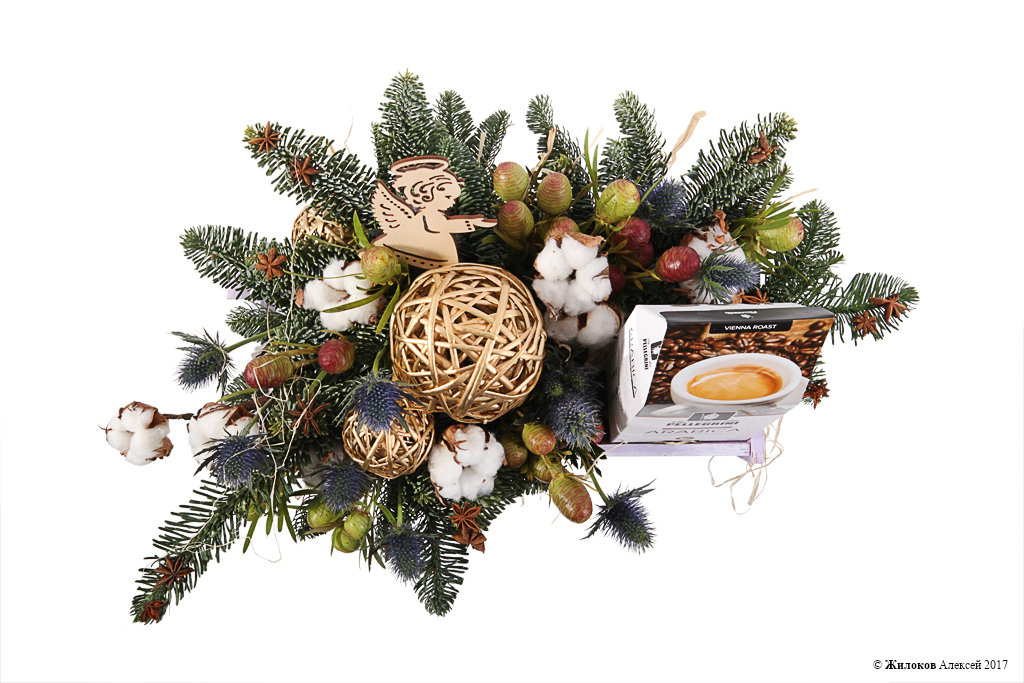 Описание: Новогодняя композиция, выполненная из веточек пушистого хлопка, зеленых лапок ели, сине-зеленых колючек эрингиума и размещенная в тематическое кашпо-саночки из дерева. Оригинальный и милый подарок к Новому году и Рождеству, который поможет передать Ваши самые теплые пожелания! А упаковка натурального молотого кофе Pellegrini (250 грамм) станет приятным сюрпризом для любителей и ценителей этого бодрящего напитка! |