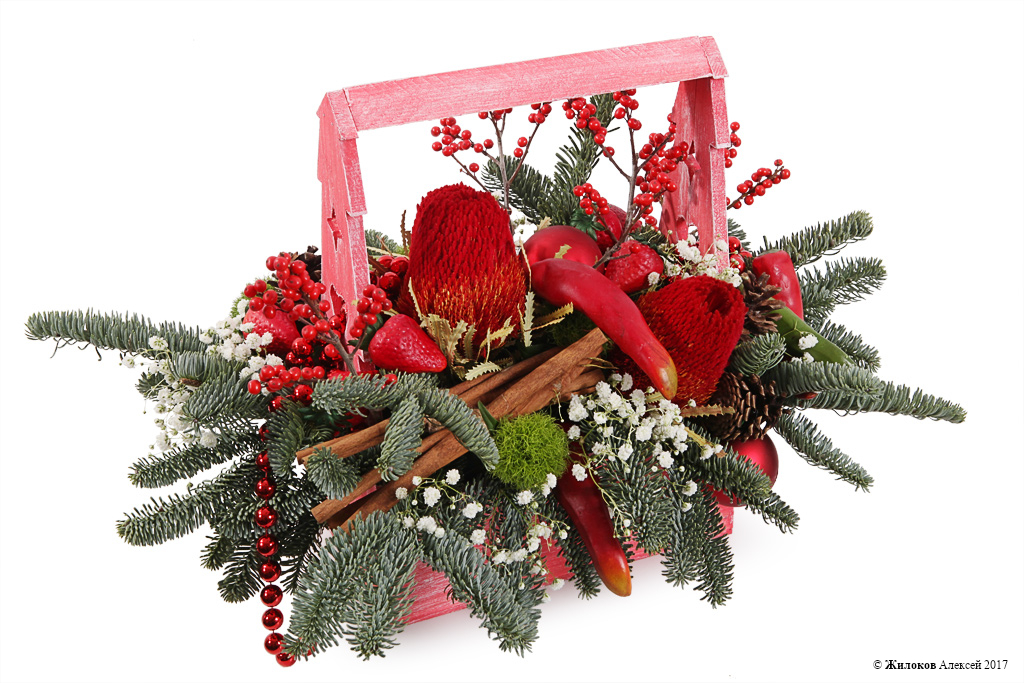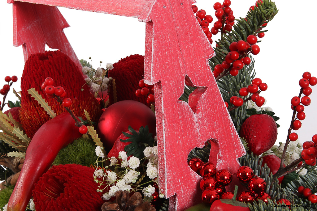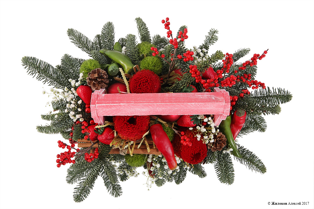 Описание: Яркая экзотическая новогодняя композиция станет оригинальным украшением новогоднего стола или домашнего интерьера. Невероятная банксия, красные ягодки илекса, зеленые лапки нобилиса вместе с необычным декором в виде перца и клубники произведут неизгладимое впечатление и составят крайне приятный сюрприз. А чарующий аромат корицы создаст праздничное настроение и подарит ощущение сказки. |