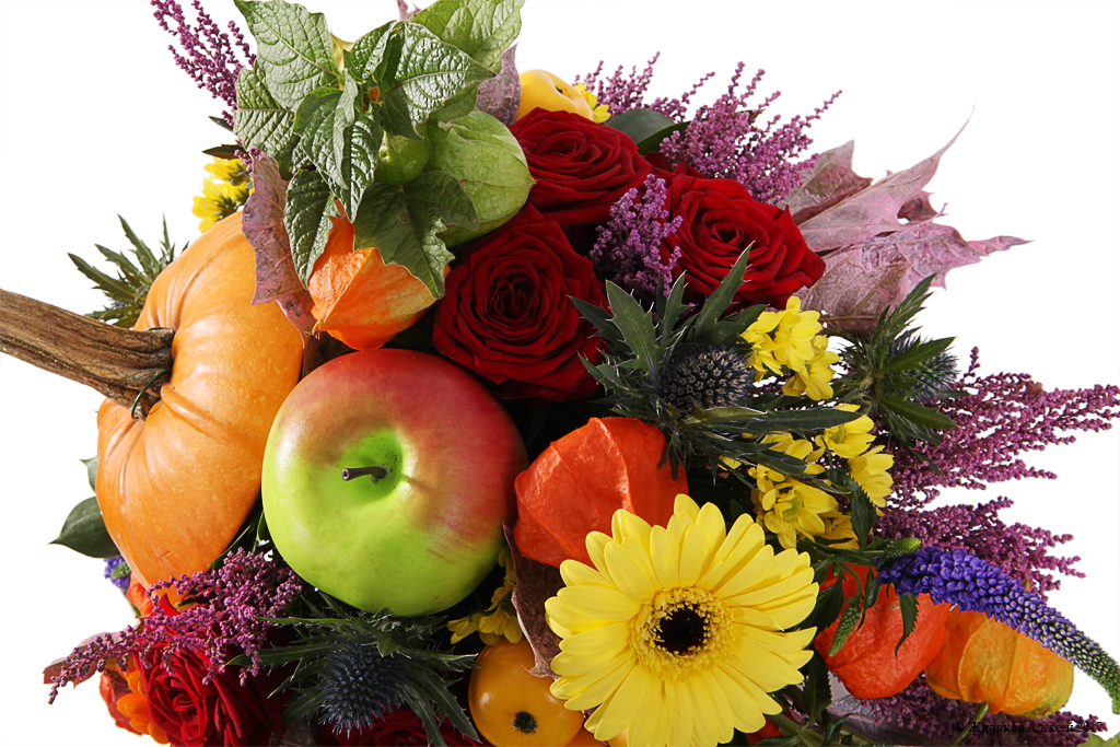 Состав: Роза Ред Наоми - 5Гербера - 2 Вероника - 3 Эрингиум - 2 Дуб красный - 1 Физалис - 1 Рускус - 4 Хризантема Сантини - 2 Декор "Яблоко" - 1 Декор "Груша" (уп.) - 1 Штёбе (банч) - 1 Тыква - 1 |