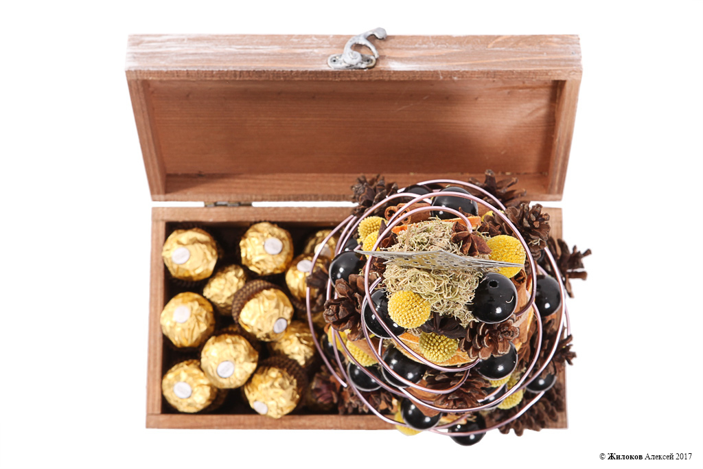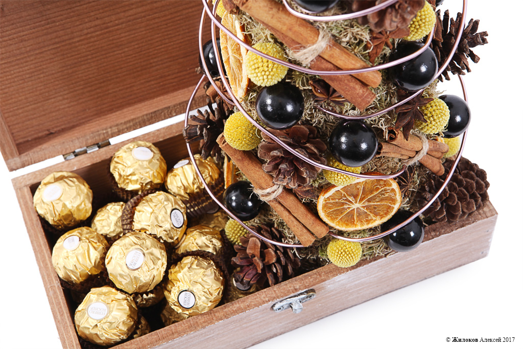 Состав: Мох сфагнум (60 г) - 1Краспедия - 20 Украшение "Шишка" - 13 Украшение на палочке - 1 Набор "Корица" (25г) - 1 Декор "Анис" - 1 Долька апельсина - 10 Жемчуг искусственный (черный) - 1 Декор - 1 Набор конфет Ferrero Rocher, 200 г - 1 Кашпо "Шкатулка низкая Лафе" - 1 |