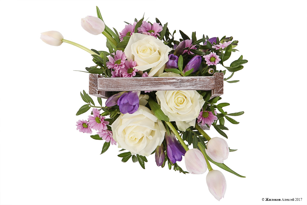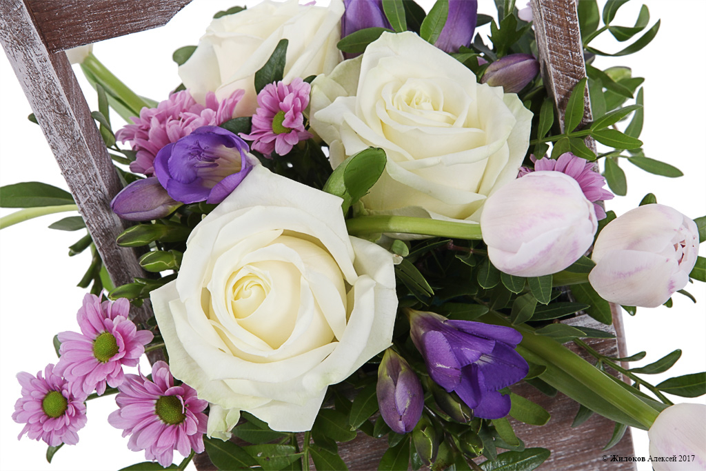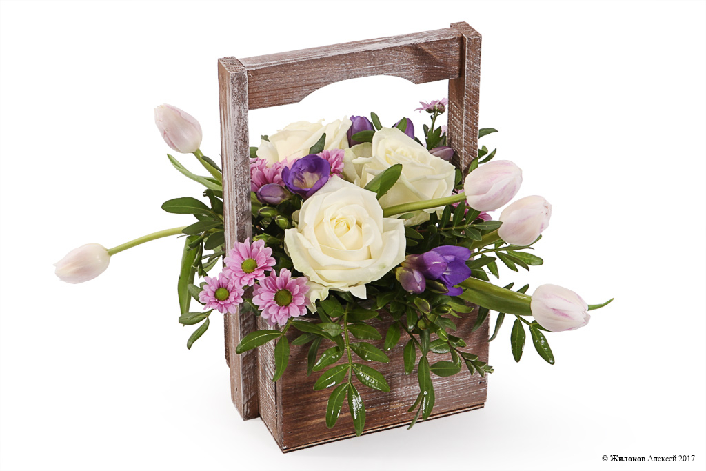 Миниатюрная цветочная композиция из фиолетовых фрезий, нежно-розовых тюльпанов, хризантем Сантини, белых роз и свежей зелени будет кстати к любому празднику и станет незабываемым и ярким подарком! А деревянное кашпо придаст презенту нотку оригинальности и подчеркнет всю изящную красоту цветов!