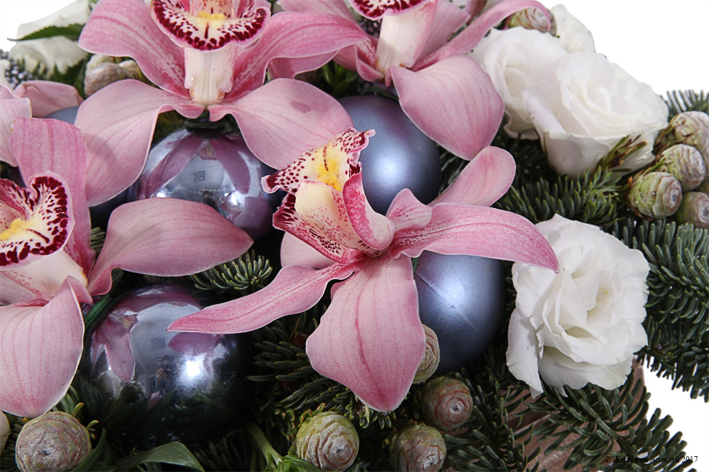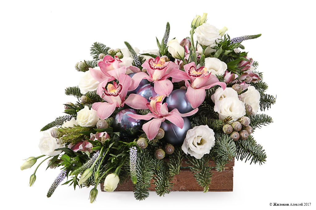 Состав: Нобилис - 6Орхидея Цимбидиум - 1 Эустома - 1 Тортум Фимейл - 1 Вероника - 10 Альстромерия - 5 Шар новогодний - 5 Кашпо "Ящик 3 рейки" - 1 |
