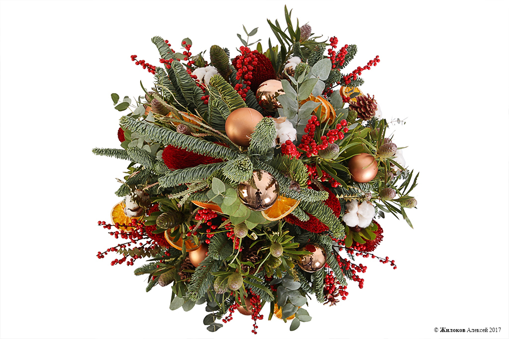 Описание: Яркая новогодняя композиция в виде елочки, украшенной экзотическими яркими банксиями, сочными дольками апельсина и россыпью красных ягод-бусин. Оригинальный подарок, который поможет создать в доме атмосферу праздника и близости настоящего чуда. |