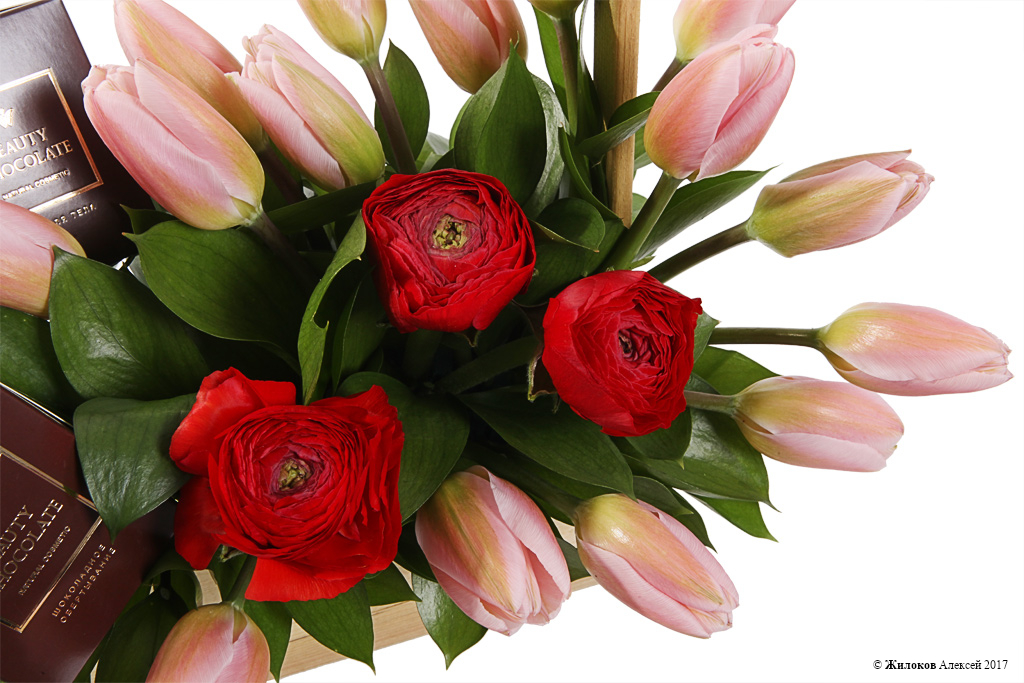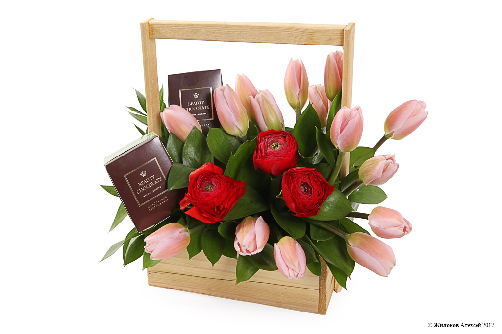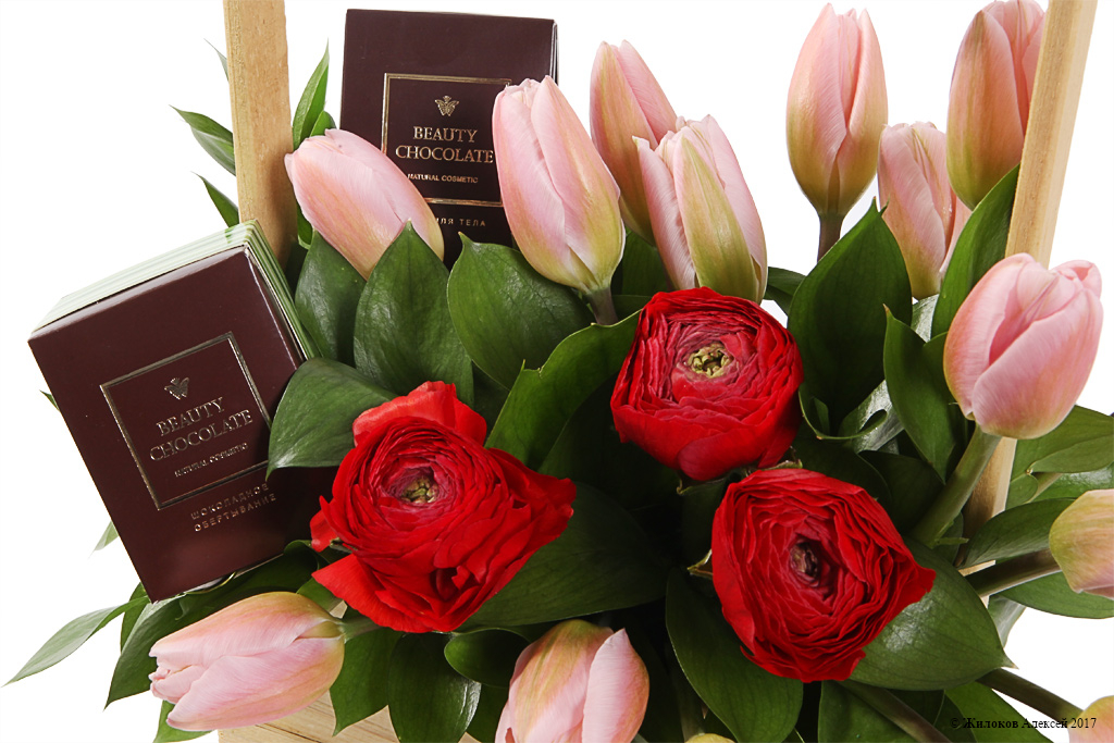 Очаровательная цветочная композиция из нежно-розовых тюльпанов и ярко-красных ранункулюсов, которая добавит любому интерьеру романтических ноток и подарит весеннее настроение в любое время года! А входящие в композицию шоколадные скраб и масло для тела - это желанный подарок для каждой девушки, который приятно удивит своего получателя!