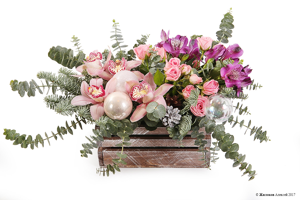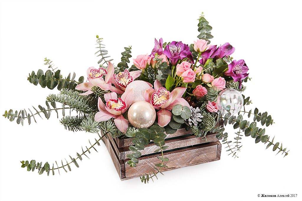 Описание: Новогодняя композиция в деревянном ящичке, словно покрытом зимним инеем, украсит любое помещение и принесет праздничное настроение, атмосферу уюта и ожидания чуда. Нежные орхидеи, розовые мелкие розы и альстромерии в окружении зелени хвои и эвкалипта являют собой само изящество и утонченность! |