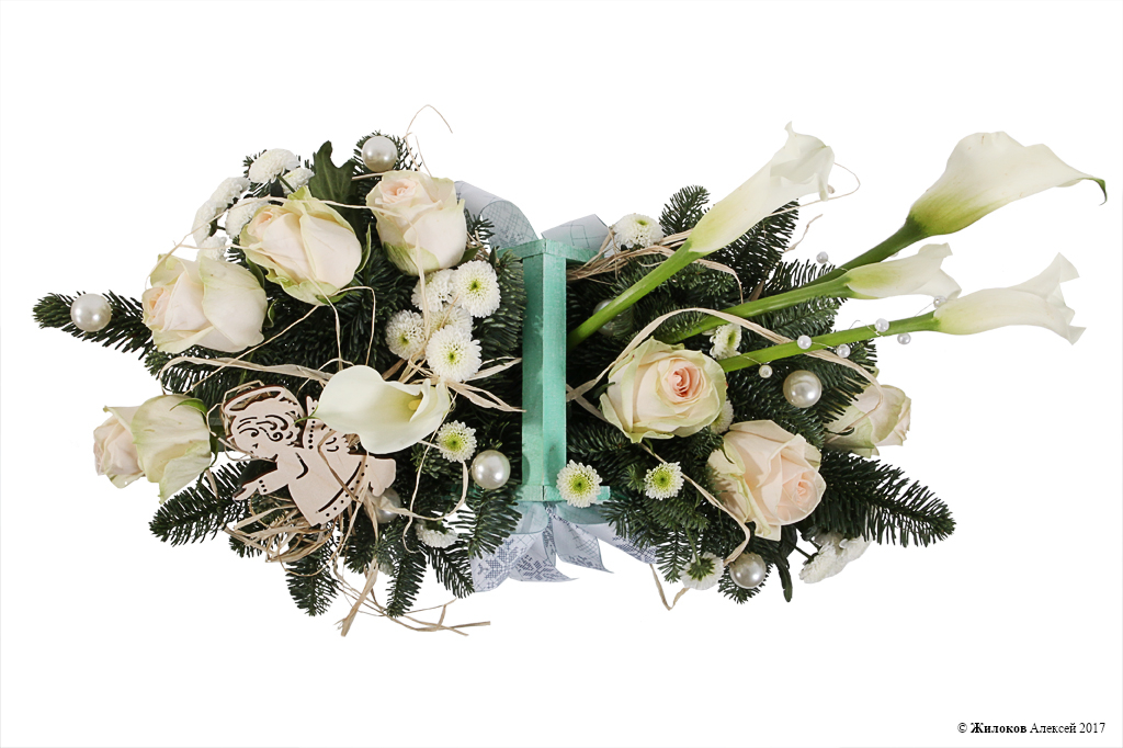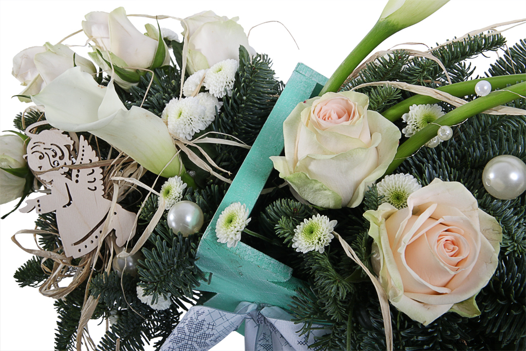Роскошная цветочная композиция, которая привнесет гармонию и атмосферу волшебства в любой интерьер. Основу композиции составляют нежно-розовые розы, белоснежные каллы и пушистые лапки нобилиса. Такая цветочная композиция станет прекрасным подарком и украшением к зимним праздникам!