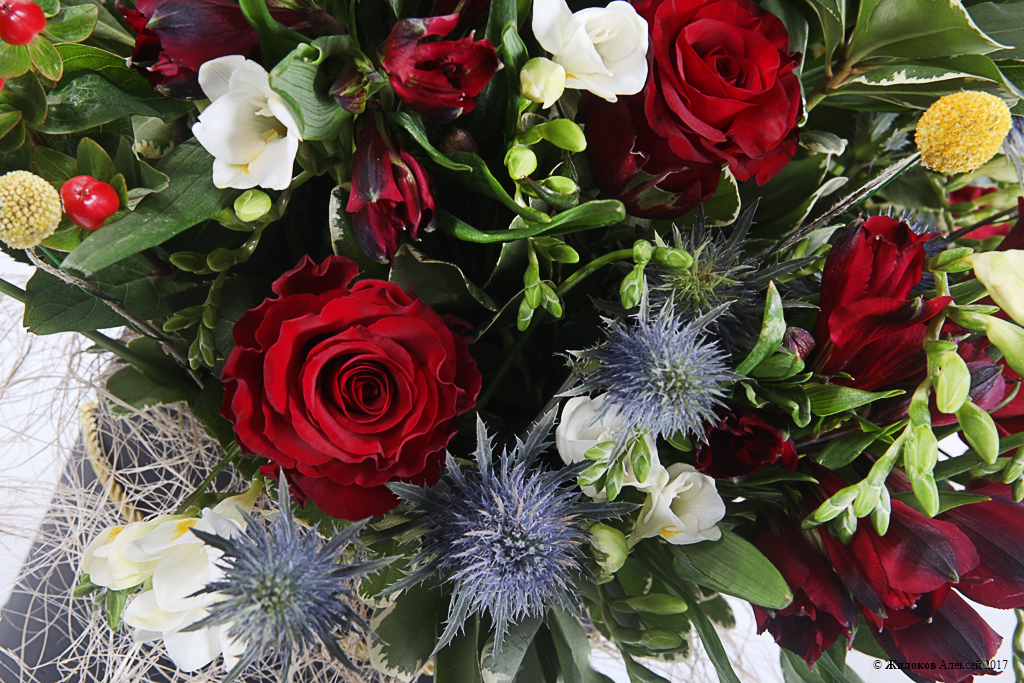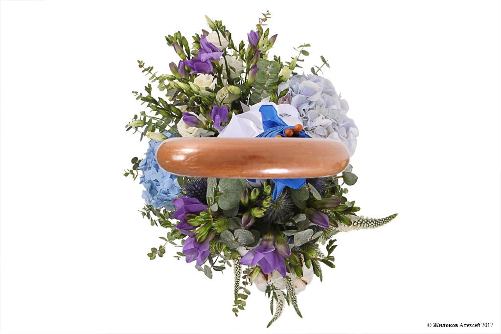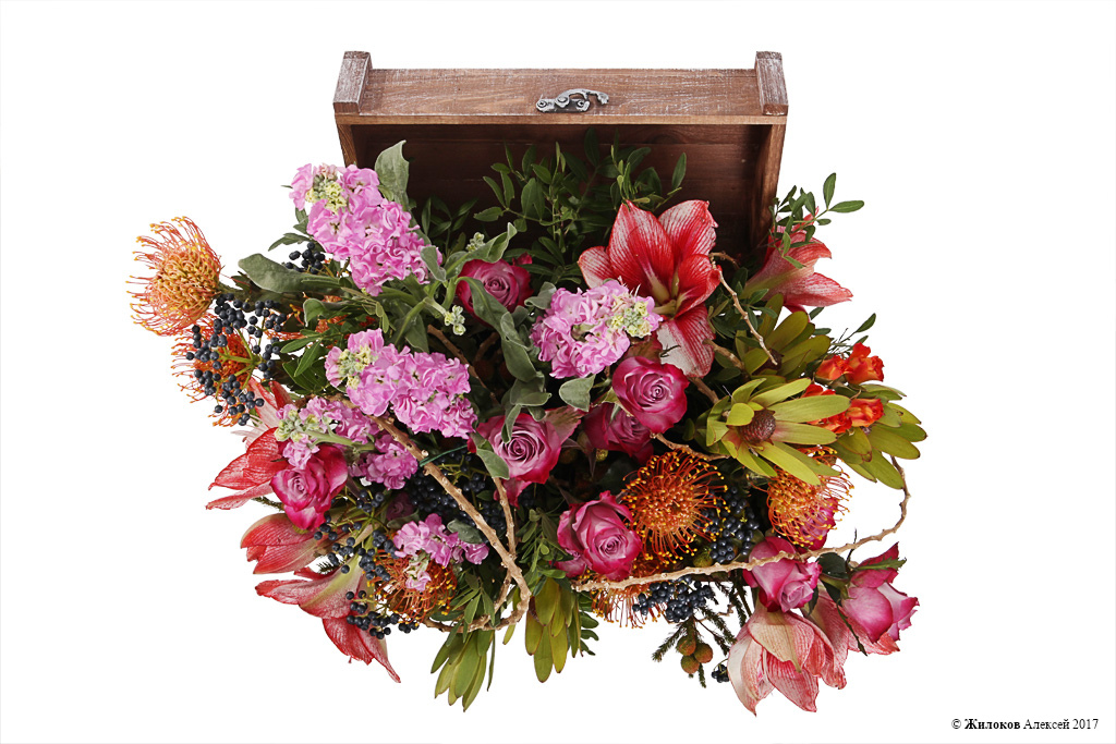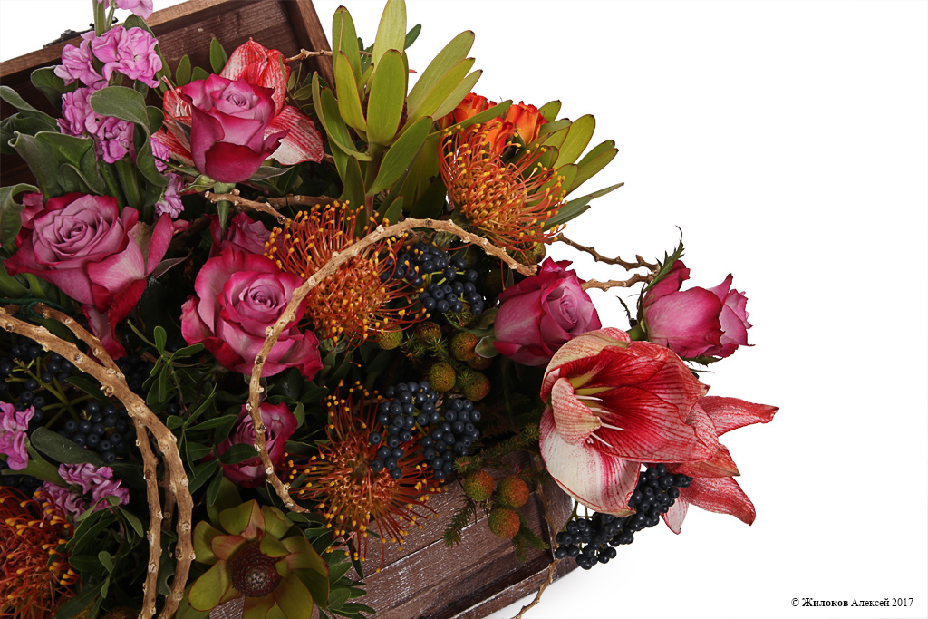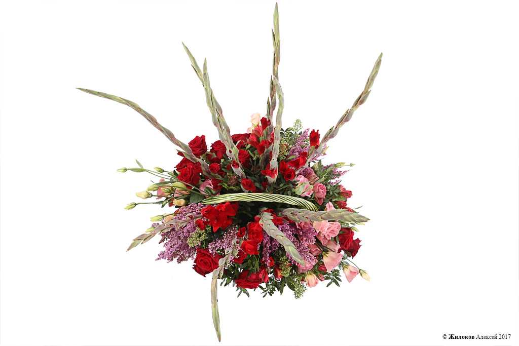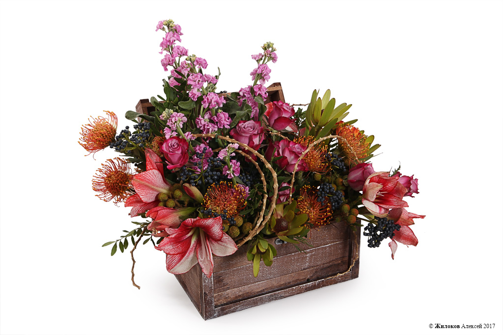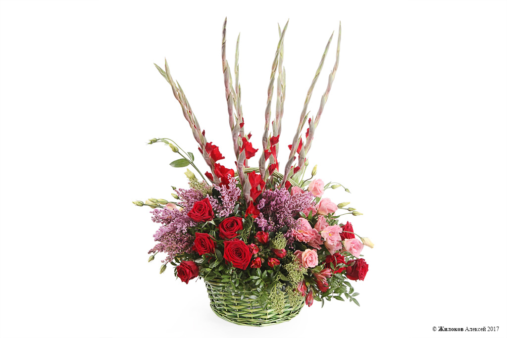 Невероятно красивая композиция с пышными и сочными цветами станет незабываемым, самым примечательным подарком на любое торжество. Удивительный, неповторимый состав корзины привлечет множество искушенных взглядов, добавит изысканность интерьеру помещения и очарует присутствующих ярким настроением.