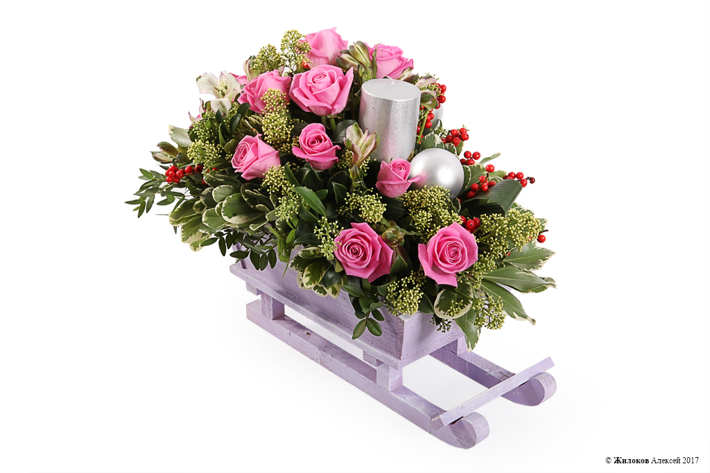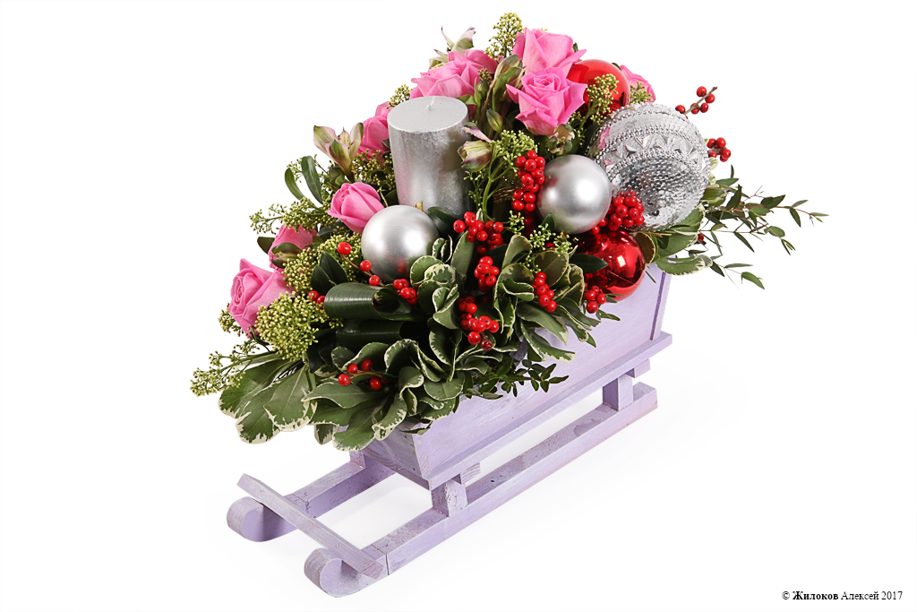 Состав: Кашпо "Сани фигурные" (17х18х35 см) - 1Шар новогодний - 5 Свеча (12х6,8 см) - 1 Роза Аква - 13 Илекс - 2 Питоспорум - 5 Аспидистра - 1 Скиммия - 1 Альстромерия - 5 |