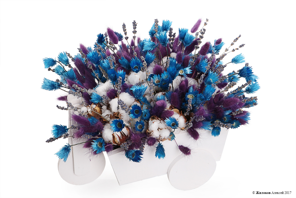 Состав: Лаванда - 1Лагурус - 1 Хлопок - 3 Эверластинг - 1 Кашпо "Велосипед" - 1 |
